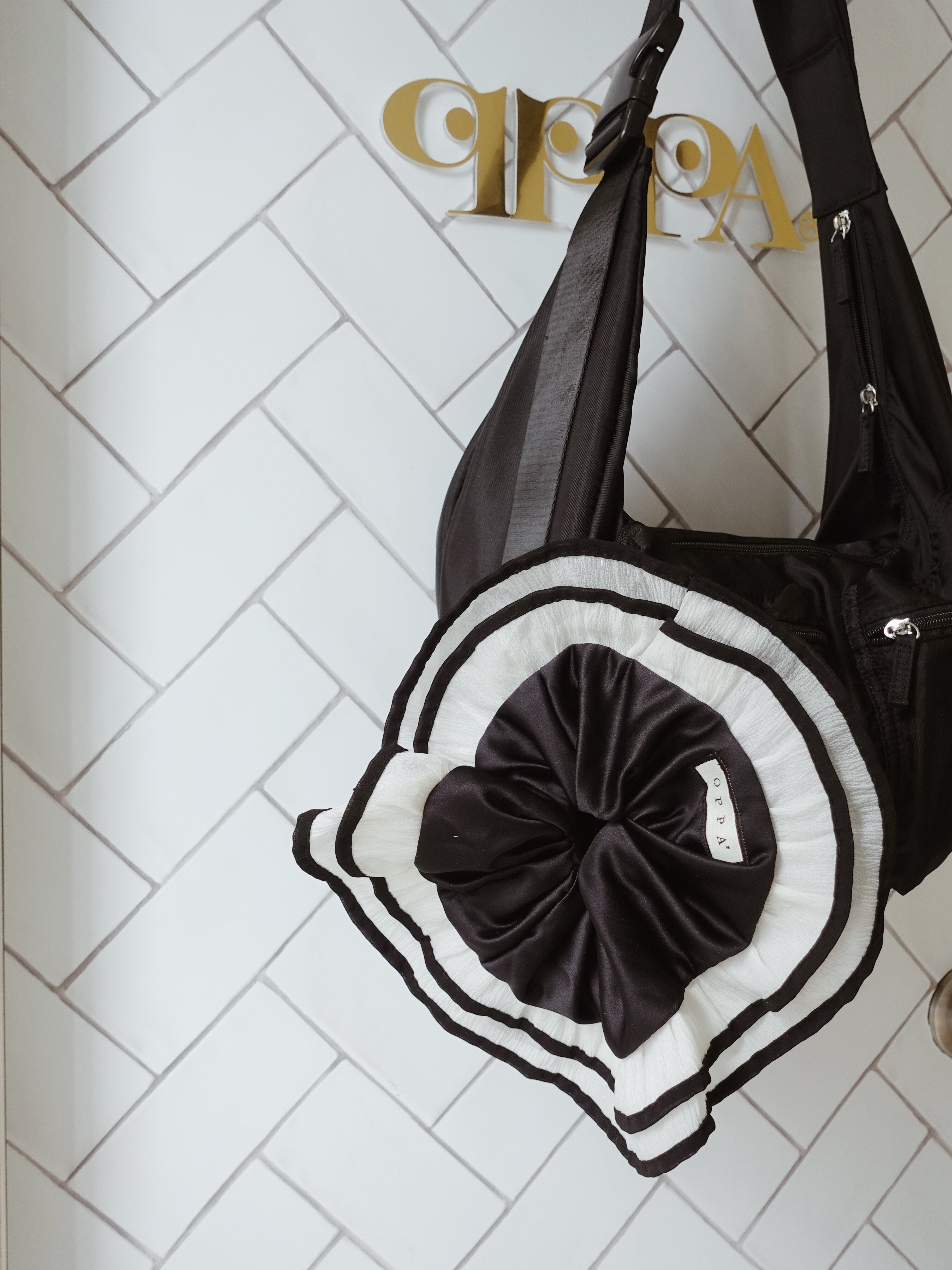 qppA®︎ 2重シフォンレースの大きめシュシュ。パールホワイトとブラックの2色展開で、レディーライクなムードが特徴のヘアアクセサリー。パイピングで引き締めたデザイン。gingham scrunchie, lace hair accessory, oversized scrunchie, qppA, handmade hair accessory