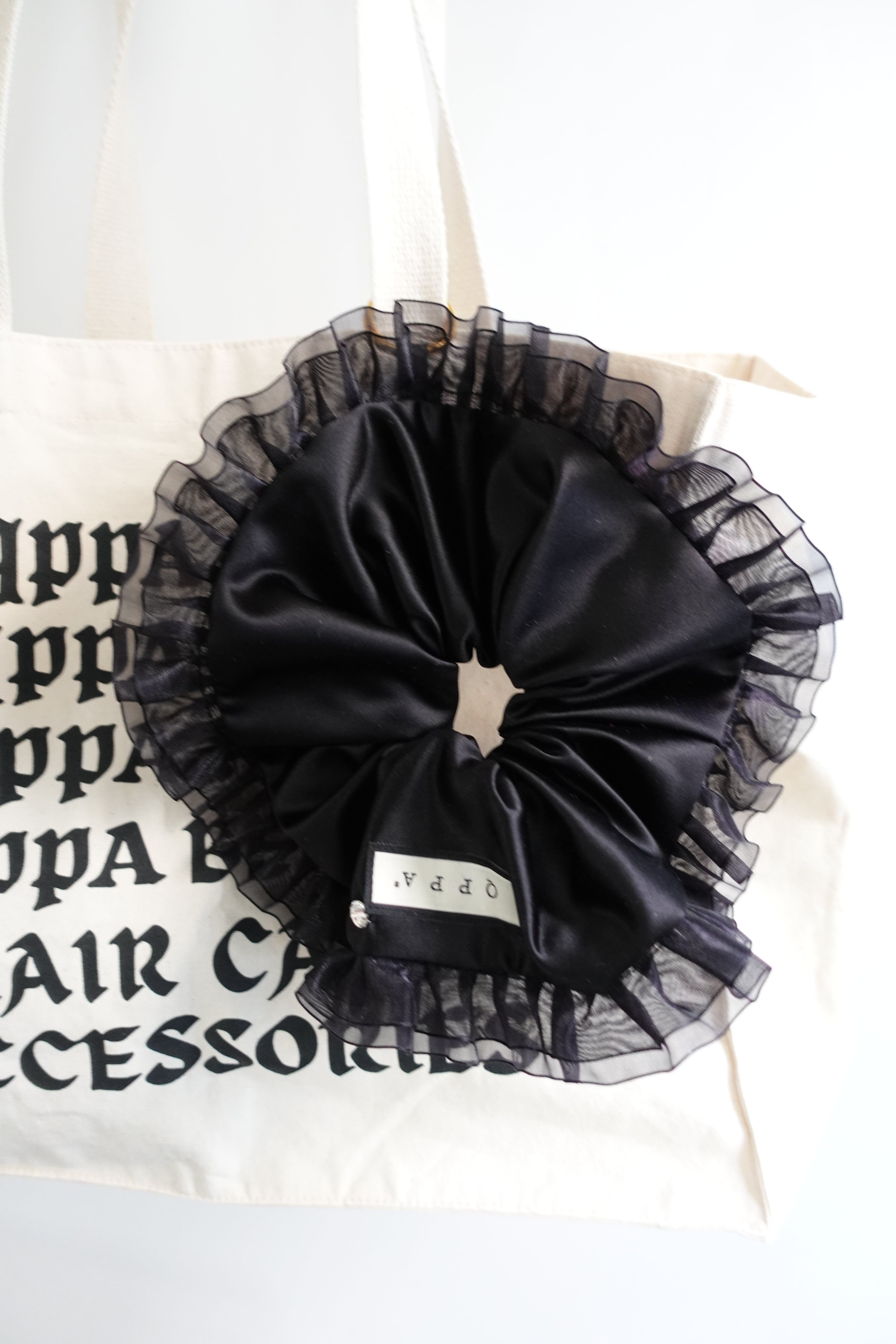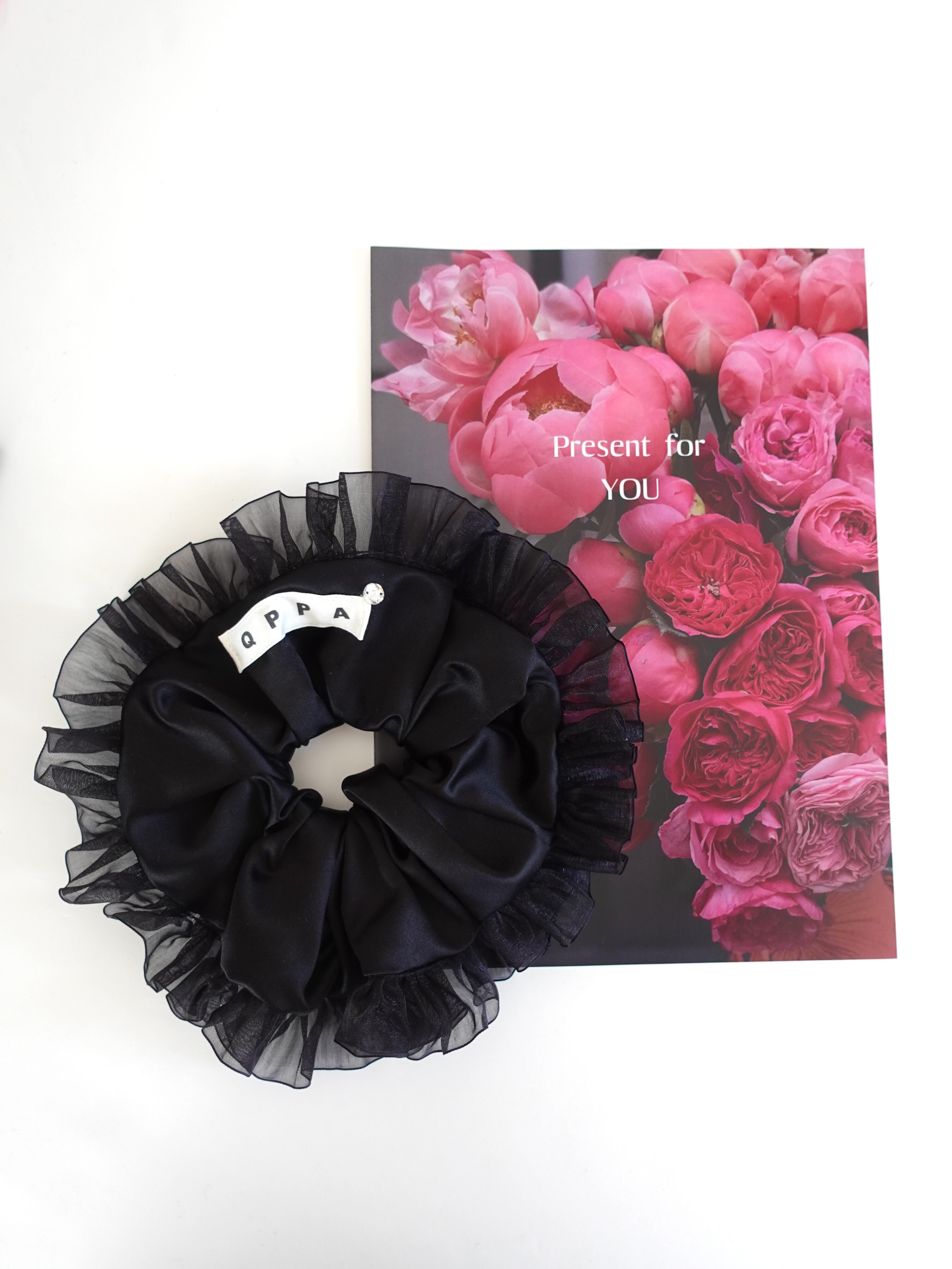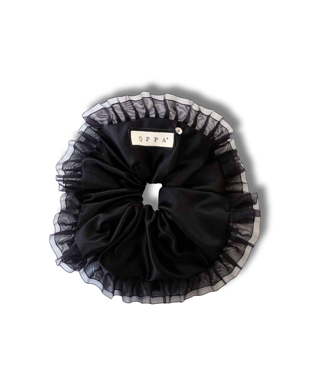 qppA®︎ ブラックのシルクポリ素材シュシュ。透け感のあるレースとビジューが特徴のシンプルで上品なヘアアクセサリー。black scrunchie, lace detail, gem accent, handmade hair accessory, qppA