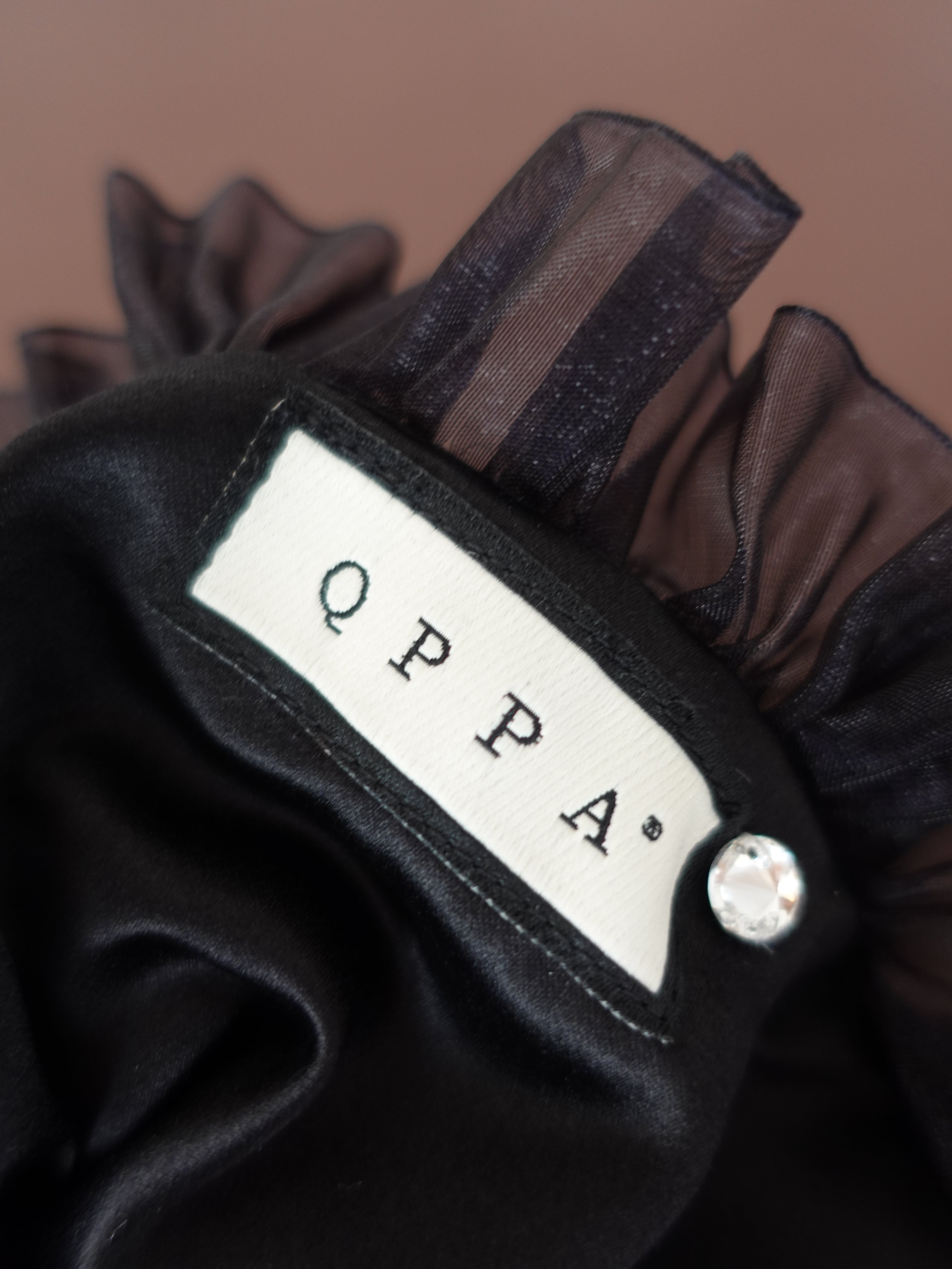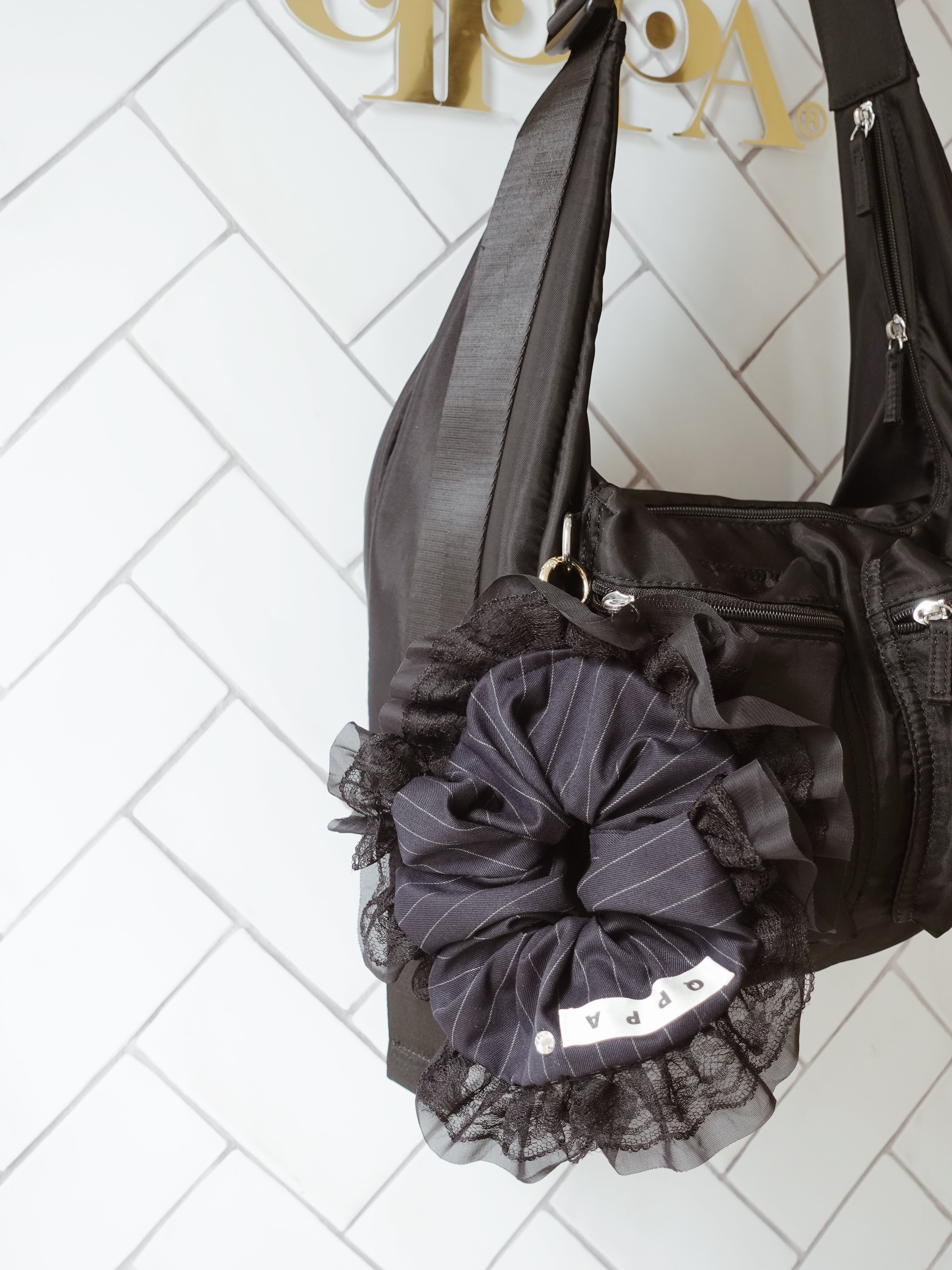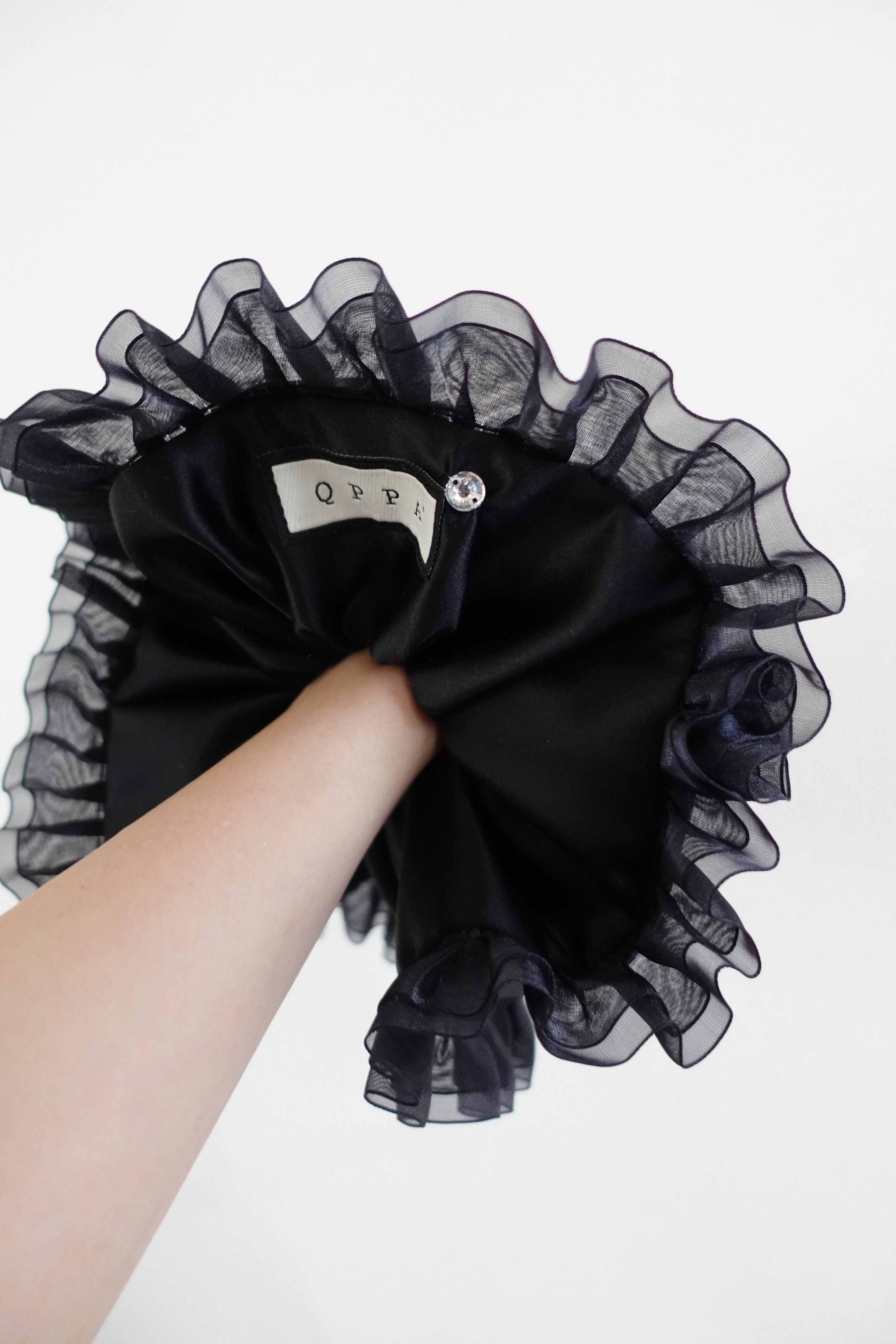 qppA®︎ ブラックのシルクポリ素材シュシュ。透け感のあるレースとビジューが特徴のシンプルで上品なヘアアクセサリー。black scrunchie, lace detail, gem accent, handmade hair accessory, qppA