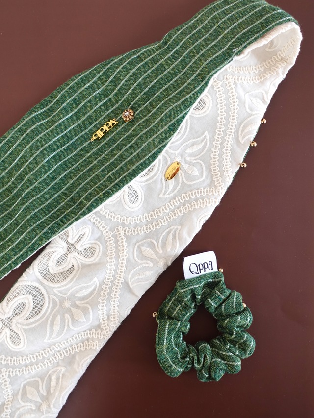 Italian Linen Stripe Beads Chou Chou(イタリアリネンストライプ・ビーズシュシュ) — グリーン / グレー 2カラー展開 —