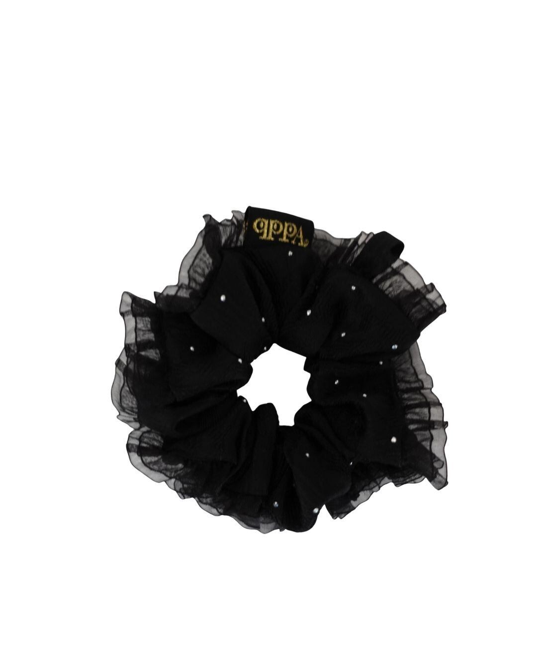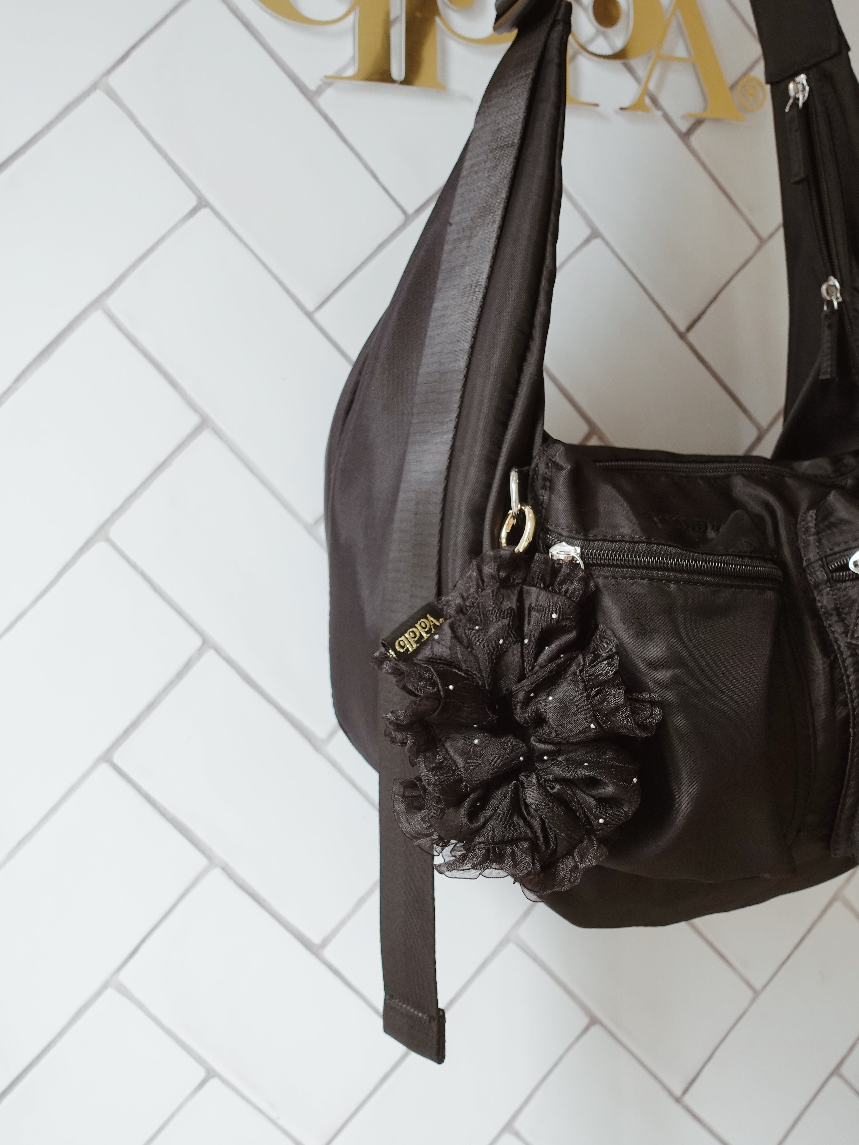 qppA®︎のブラックレースシュシュ。スパンコールがさりげなく輝き、12cmサイズで使いやすいデザイン。バッグチャーム仕様(内側ループ付き)で、別売り金具を追加すれば2wayで楽しめる。black lace scrunchie, sequin hair accessory, mini scrunchie bag charm, qppA, elegant scrunchie