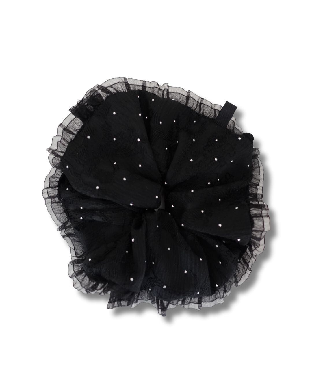 立体感のあるブラック生地に繊細なレースを重ね、ところどころに散りばめたスパンコールがさりげなく光を集めるシュシュ。