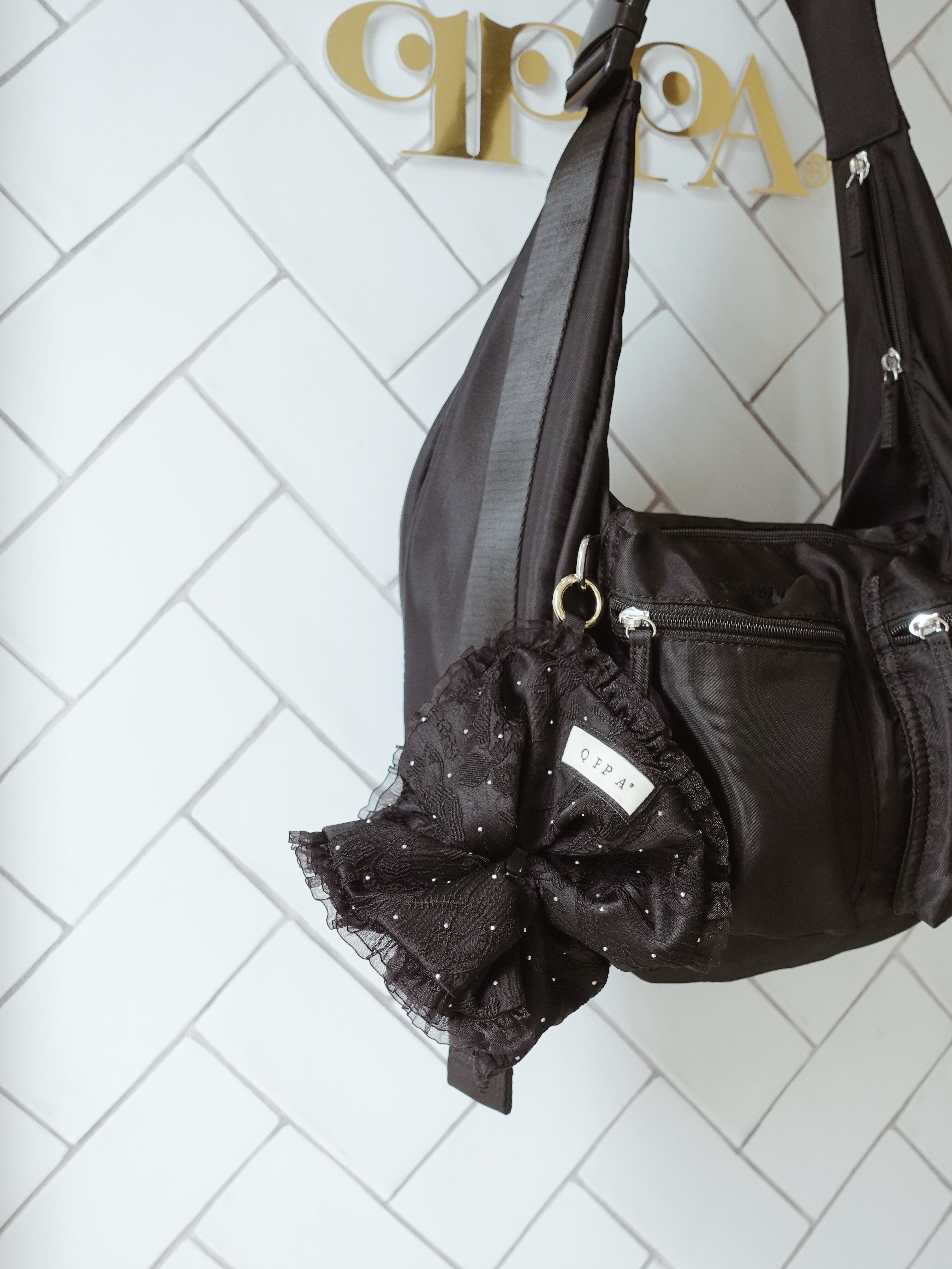 qppA®︎のブラックレースシュシュ。スパンコールがさりげなく輝き、12cmサイズで使いやすいデザイン。バッグチャーム仕様(内側ループ付き)で、別売り金具を追加すれば2wayで楽しめる。black lace scrunchie, sequin hair accessory, mini scrunchie bag charm, qppA, elegant scrunchie