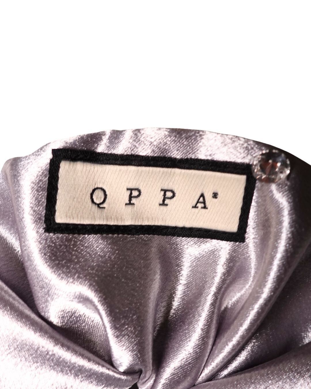 qppA®︎のシルバーシュシュ。光沢のある生地とラメパイピングが華やかで、16cmサイズの程よいボリューム感。髪にも手首にも映えるデザイン。silver scrunchie, shimmer piping scrunchie, metallic hair accessory, qppA, elegant scrunchie"