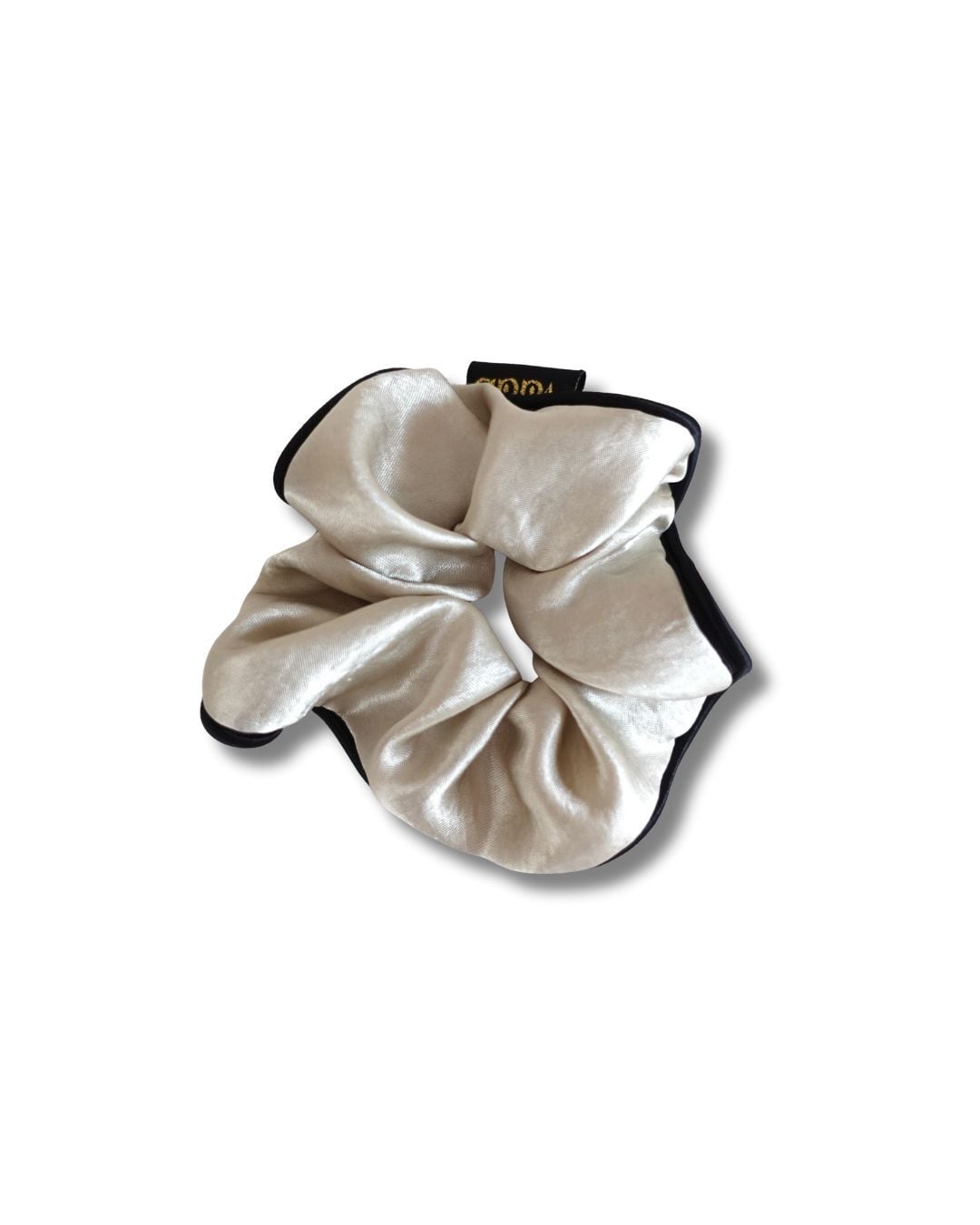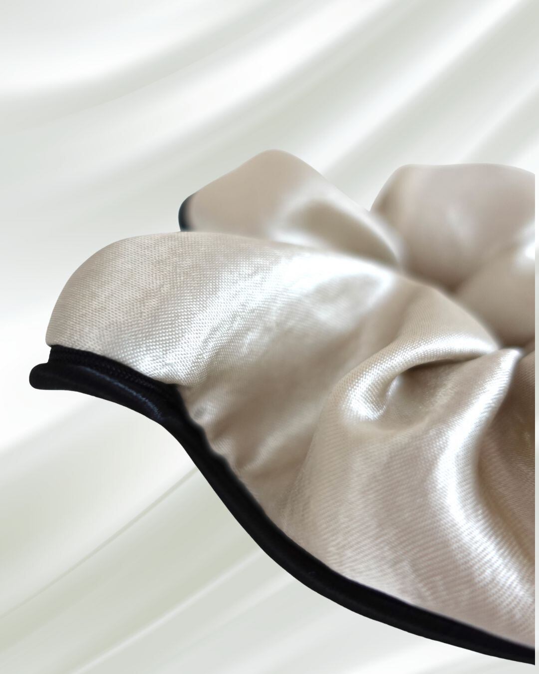 qppA®︎のロイヤルパイピングシュシュ。11cmサイズの小ぶりなデザインで、髪にも手首にも使いやすい。光沢感のあるサステナブル生地にブラックのパイピングを効かせた洗練スタイル。お揃いのキュッパカバーとのコーディネートもおすすめ。sustainable scrunchie, mini scrunchie, royal piping hair accessory, qppA, elegant scrunchie