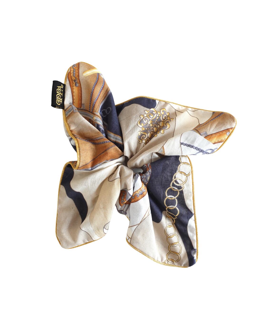 気品漂うクラシックなスカーフ柄を、ドイツ製の上質なコットンで仕立てたスクエア型のビッグシュシュ。