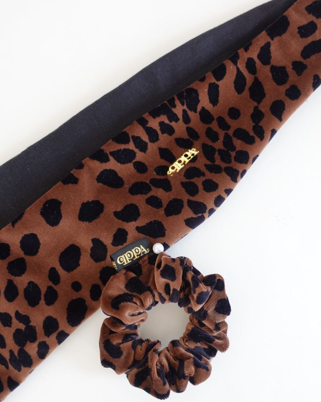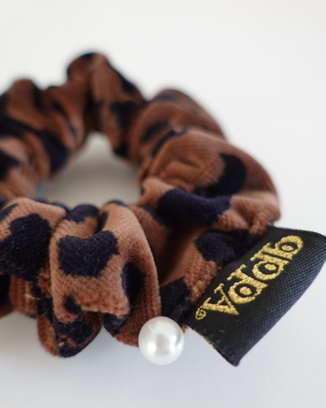 qppA®︎のベロアレオパード柄シュシュ。深みのあるブラウンとブラックの組み合わせが大人可愛い雰囲気。お揃いのキュッパカバーも展開。velvet leopard scrunchie, brown bambi scrunchie, animal print hair accessory, qppA"
