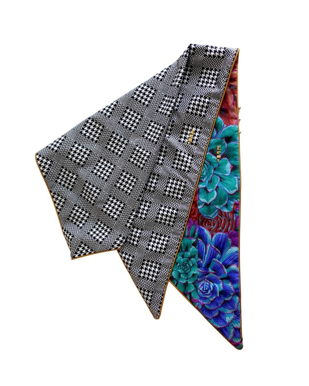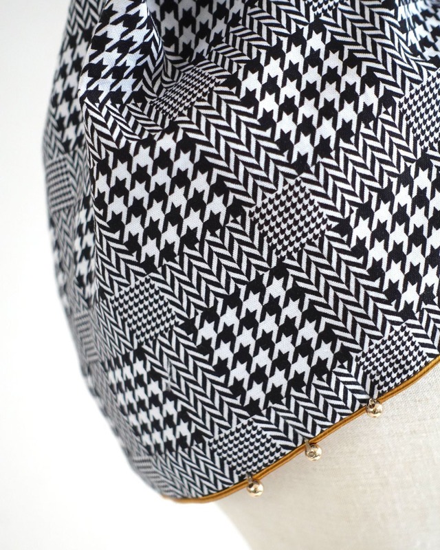 秋冬にも映えるチェック柄と、鮮やかな花柄の大胆な組み合わせを、ゴールドの全周パイピングで引き締めました。