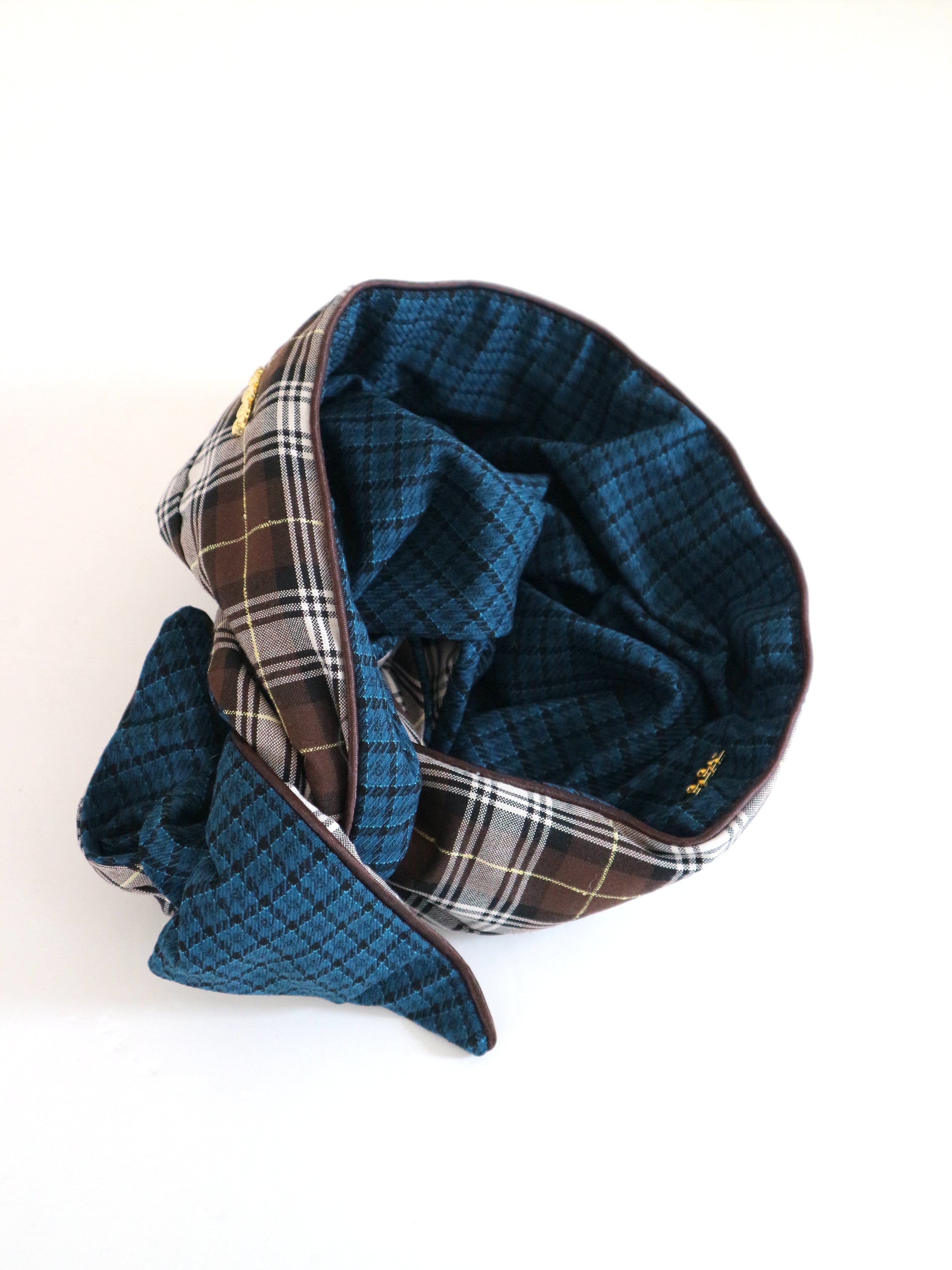 クラシカルなチェック柄を、秋に心地よくまとえるように仕立てたリバーシブルターバン。