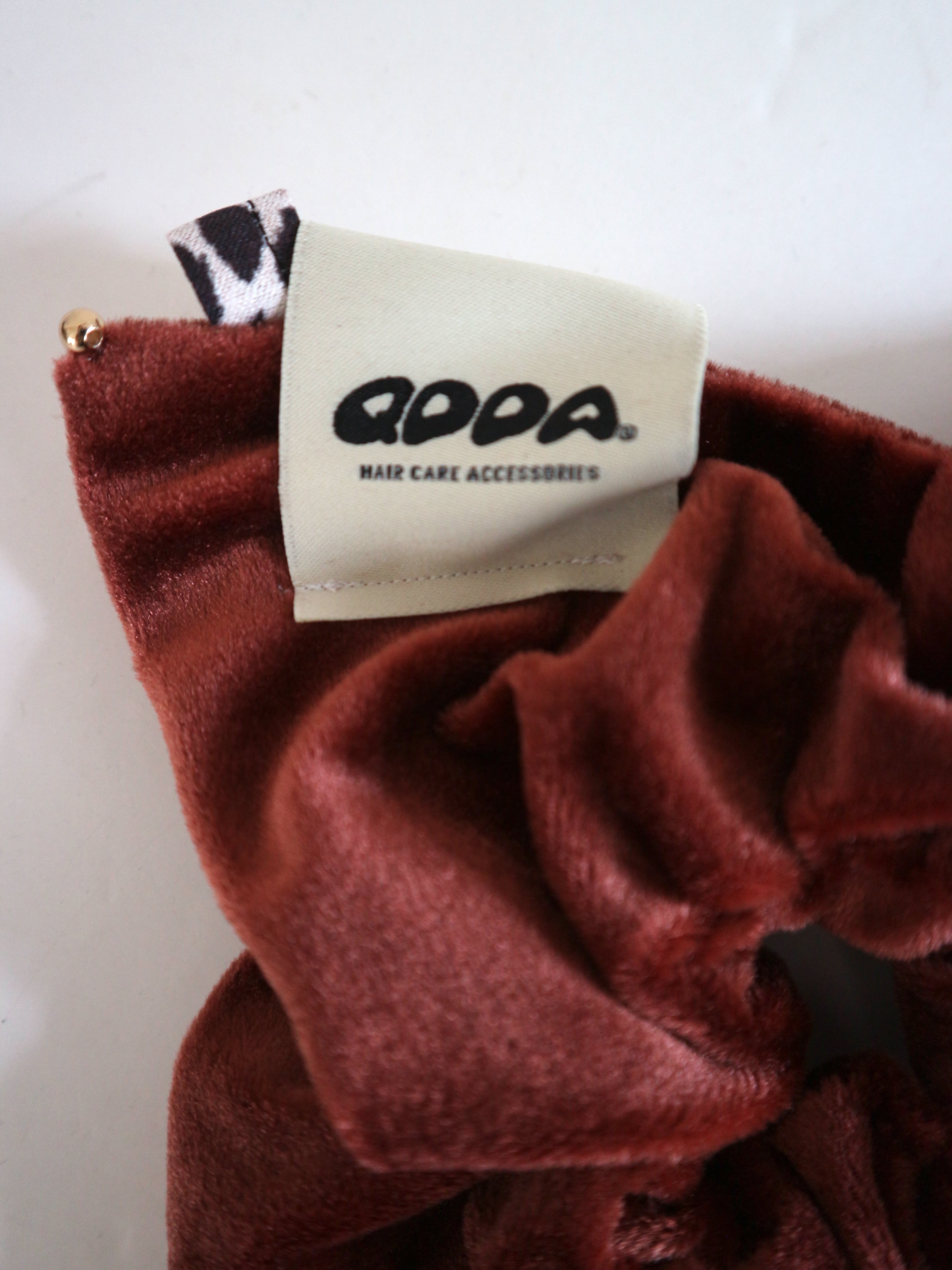 qppA®︎オリジナルのスクエアベルベットシュシュ。テラコッタカラーの上品な光沢と、角にあしらわれたゴールドビジューが印象的。裏面には“Hug my hair, Feel my rhythm, Love myself.”のメッセージ入りタグ。square velvet scrunchie, terracotta hair accessory, qppA