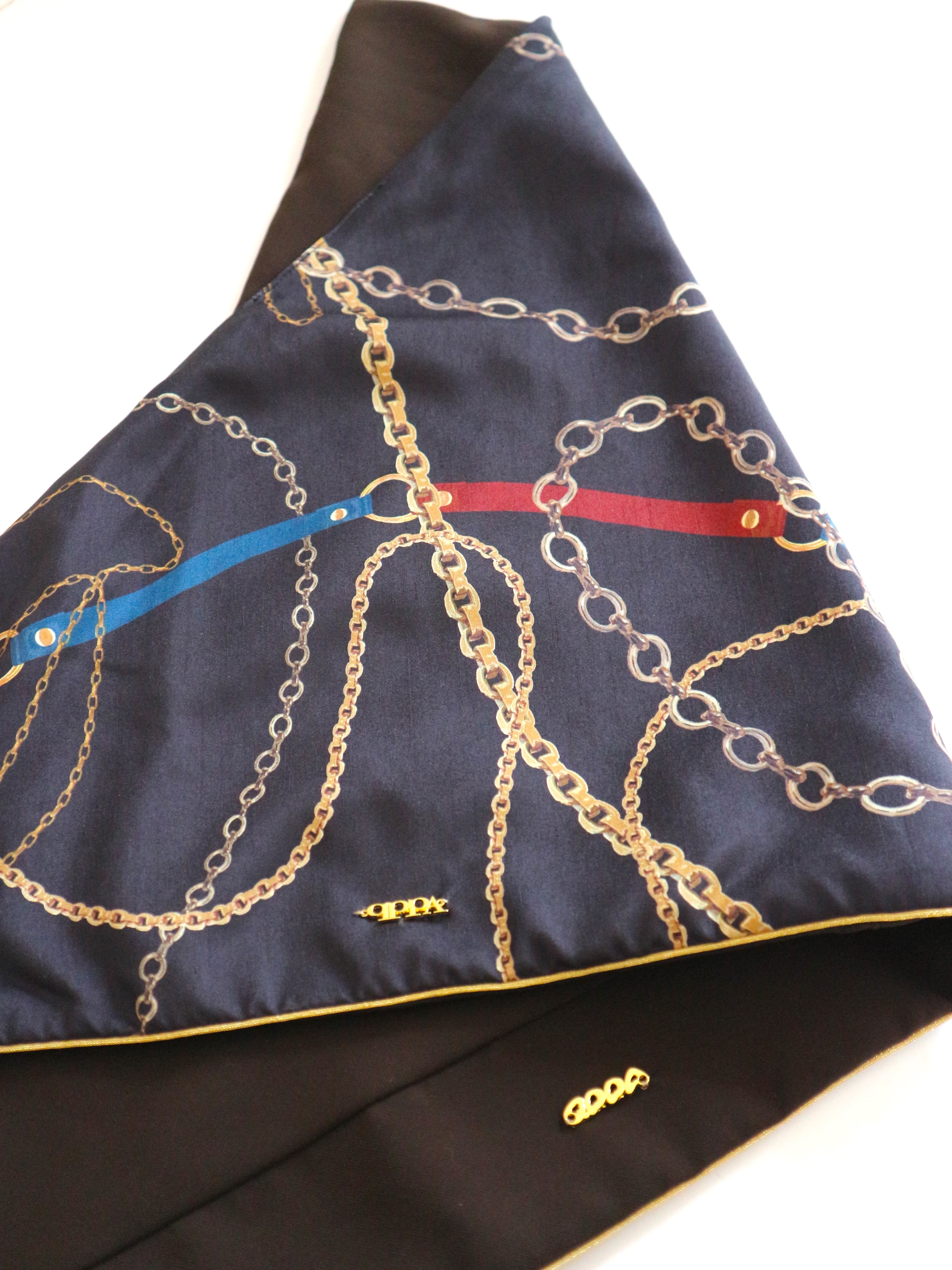 チェーン&レザーベルト柄が描かれたブラックネイビーベースのデザイン。