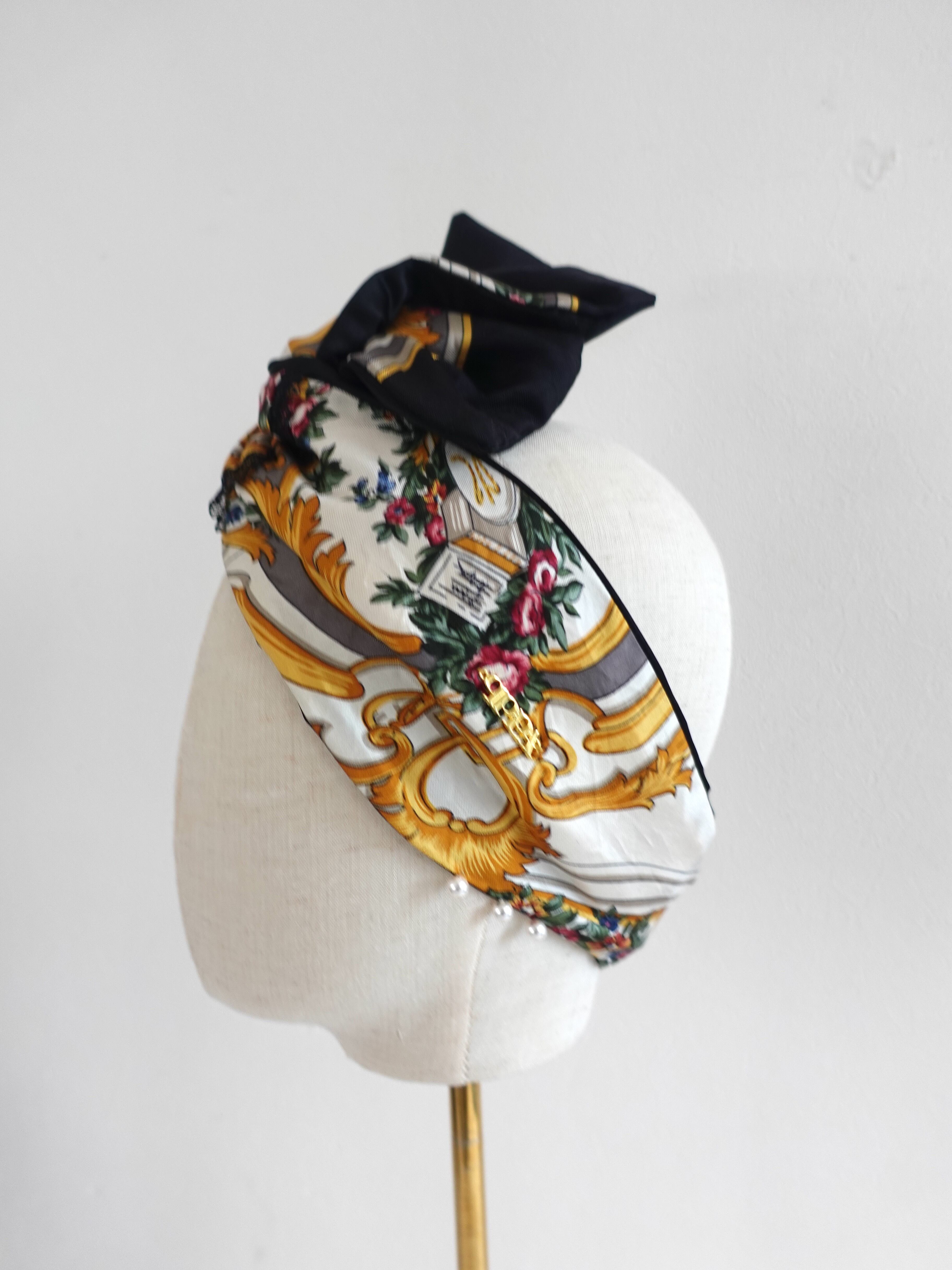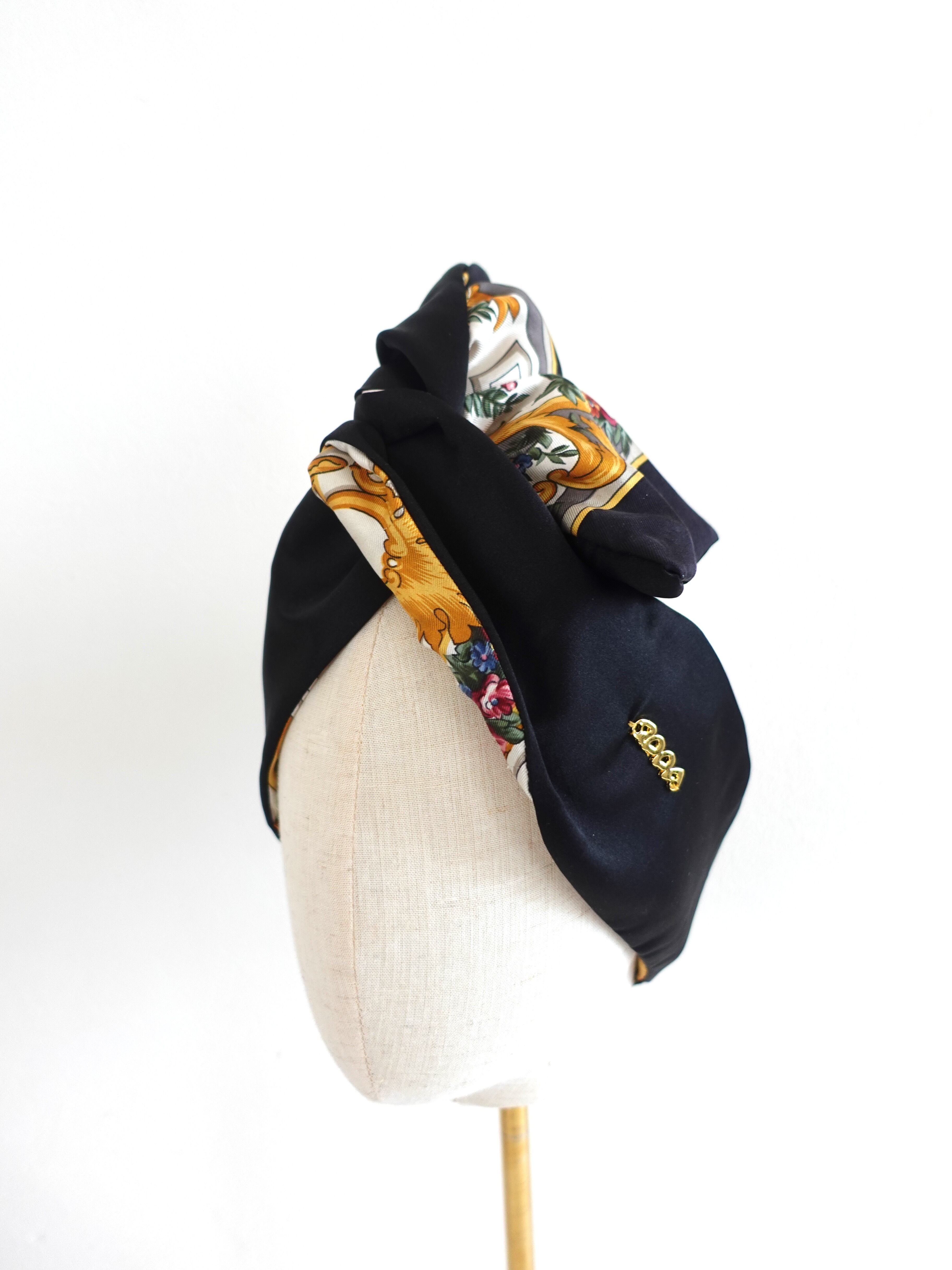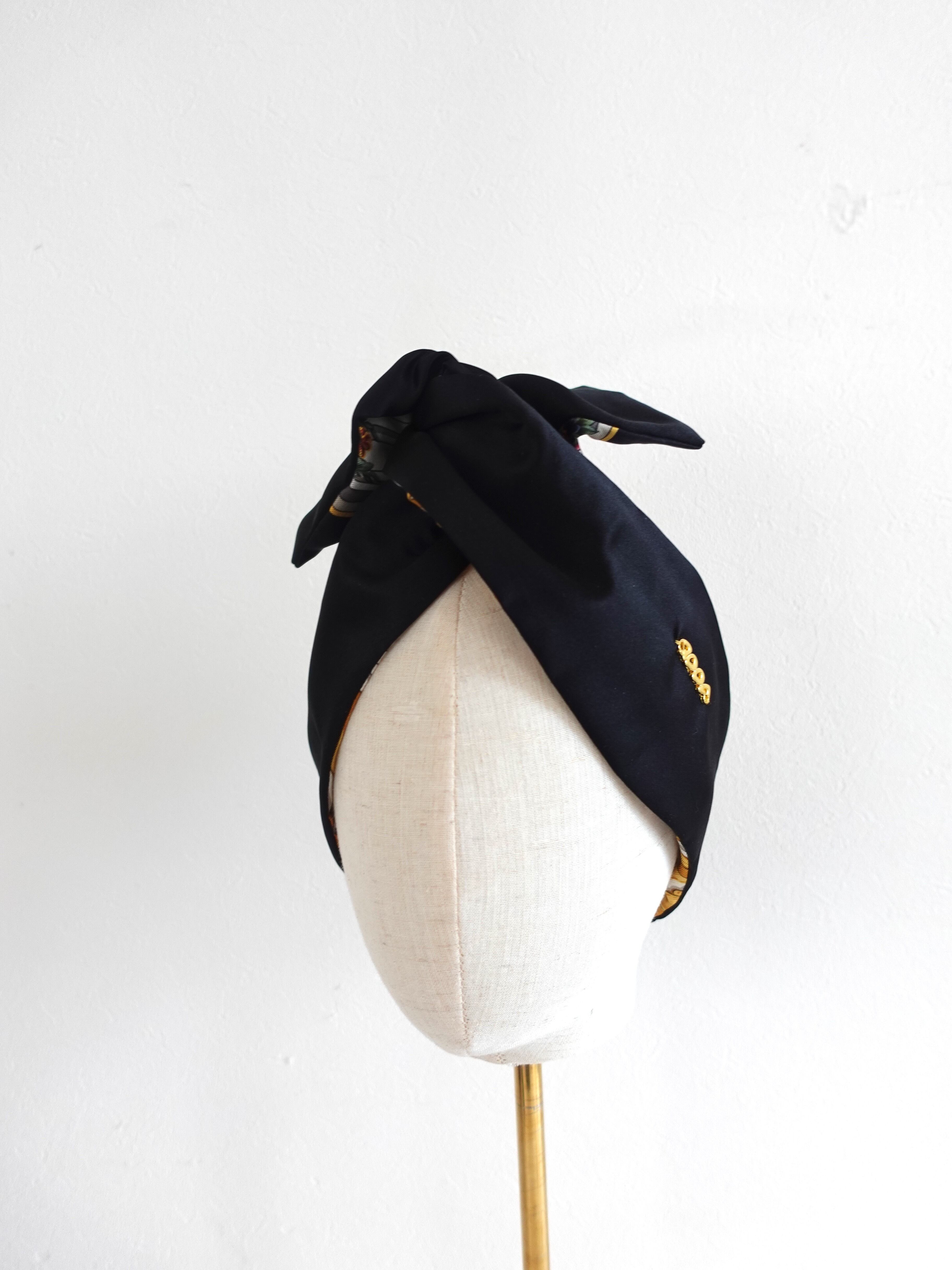 reversible silk turban, vintage scarf wrap, black silk rayon headband, pearl hair wrap, qppA turban Japan