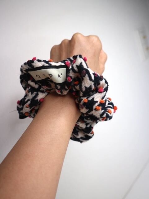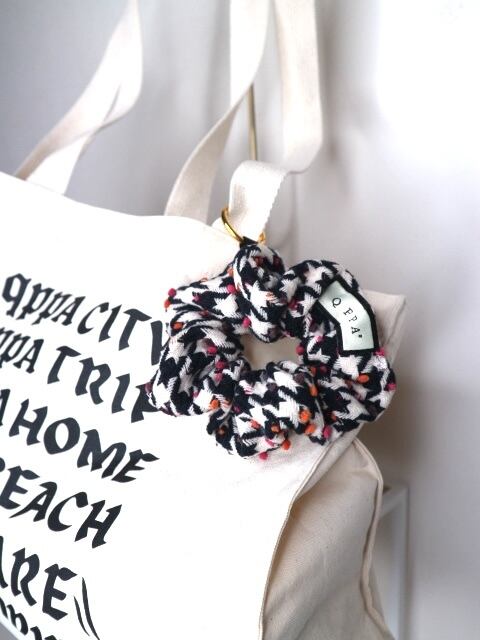 イタリア製の上質ウールを使用した、 クラシックな千鳥格子に遊び心あるドットが映えるシュシュ。 しっかりとしたウールの質感ながら、軽やかな付け心地。 ヘアアレンジにはもちろん、バッグチャームとしても活躍します。 周囲にはパールを縫製しております。 ベーシックの中に彩りを添える、 冬の装いにぴったりな大人のアクセサリーです。 特徴 イタリア製ウール使用 千鳥格子 × カラーネップデザイン バッグチャーム仕様(チャームは別売り) qppA®︎ロゴタグ付き 約12cmサイズ(ウールタイプ)