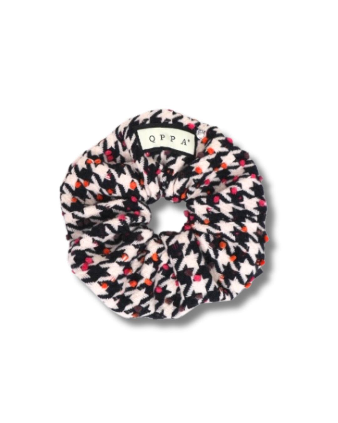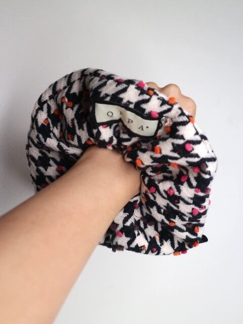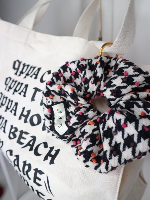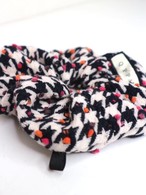 イタリア製の上質ウールを使用した、 クラシックな千鳥格子に遊び心あるドットが映えるシュシュ。 しっかりとしたウールの質感ながら、軽やかな付け心地。 ヘアアレンジにはもちろん、バッグチャームとしても活躍します。 周囲にはパールを縫製しております。 ベーシックの中に彩りを添える、 冬の装いにぴったりな大人のアクセサリーです。 特徴 イタリア製ウール使用 千鳥格子 × カラーネップデザイン バッグチャーム仕様(チャームは別売り) qppA®︎ロゴタグ付き 約16cmサイズ(ウールタイプ)