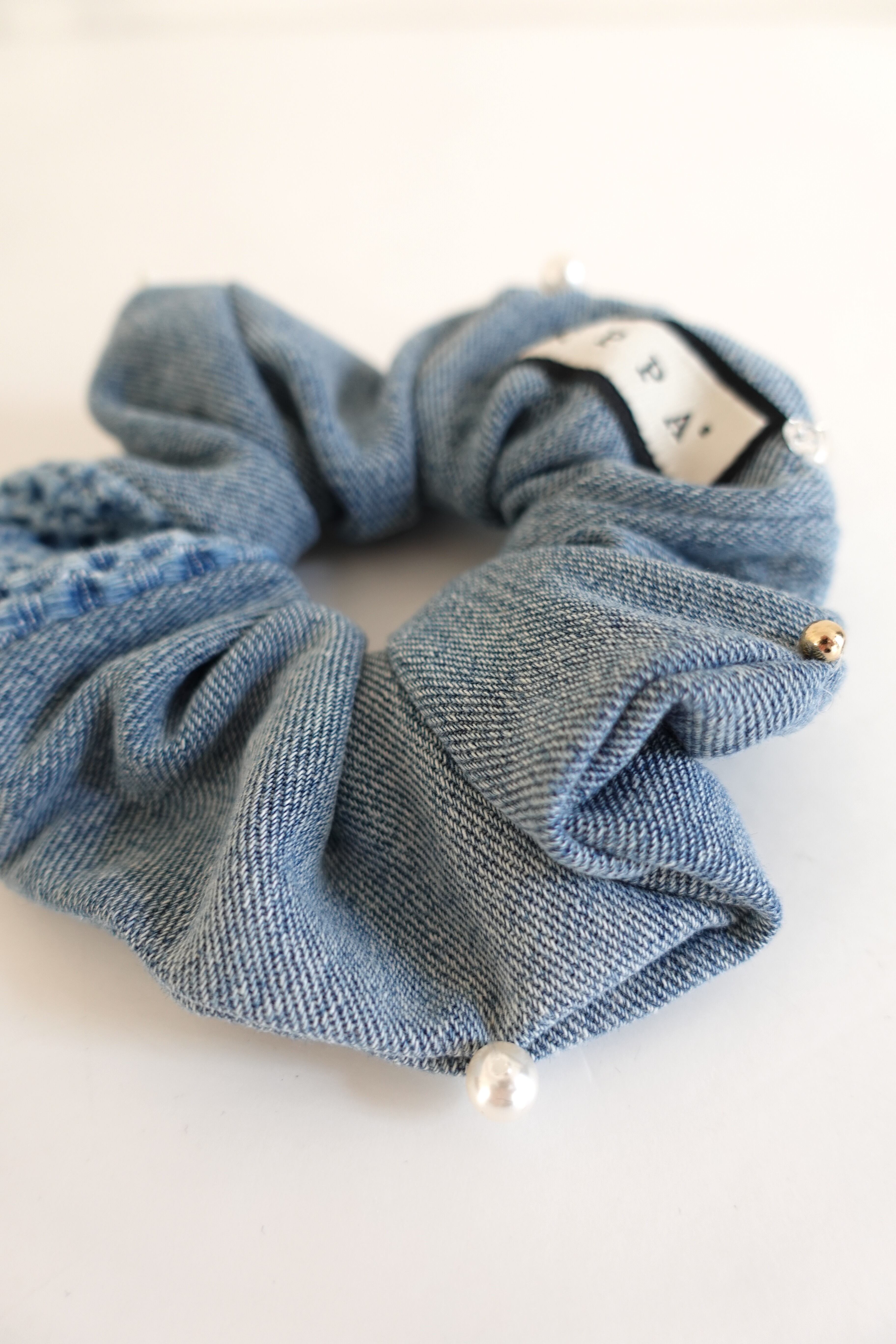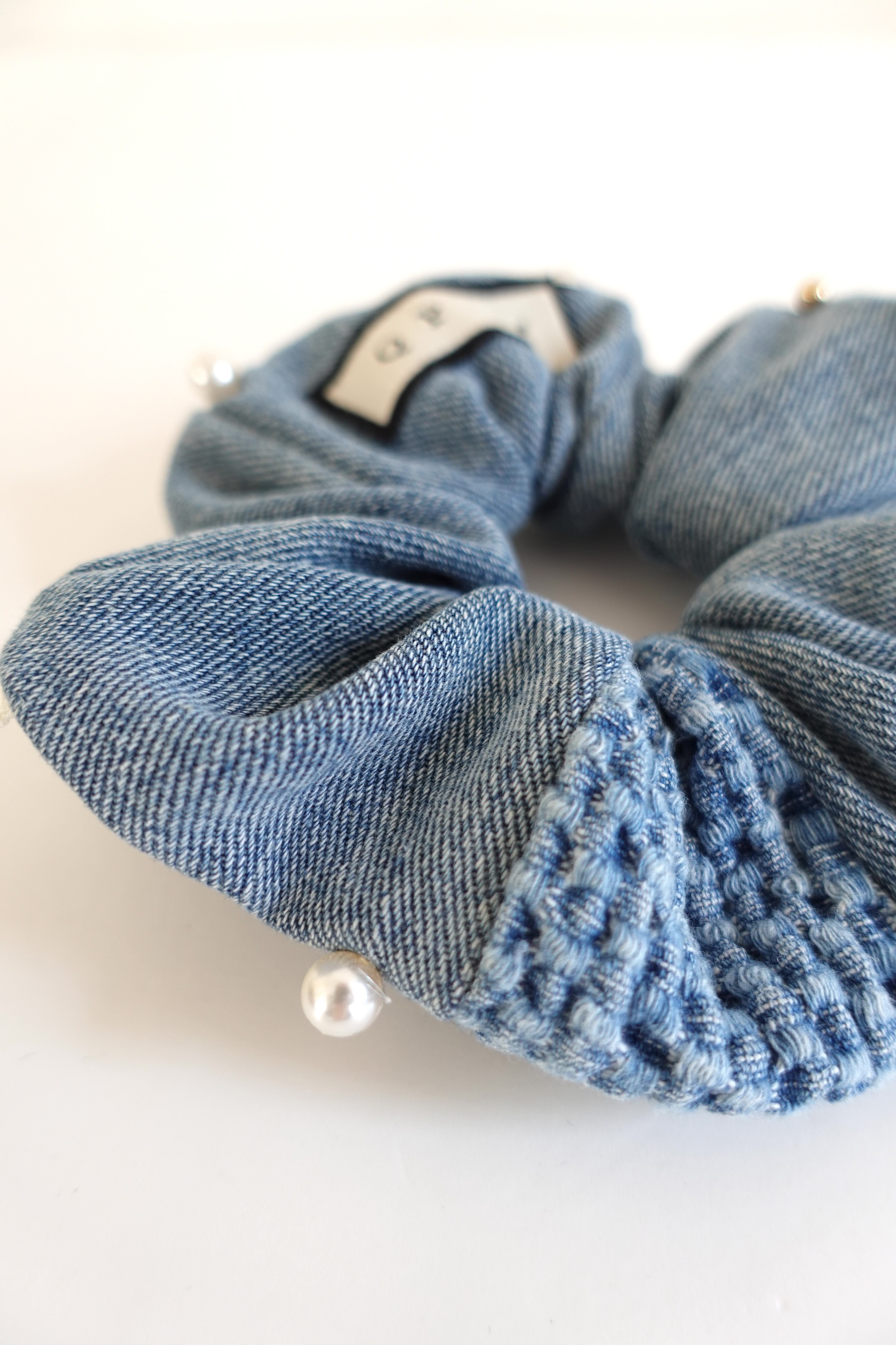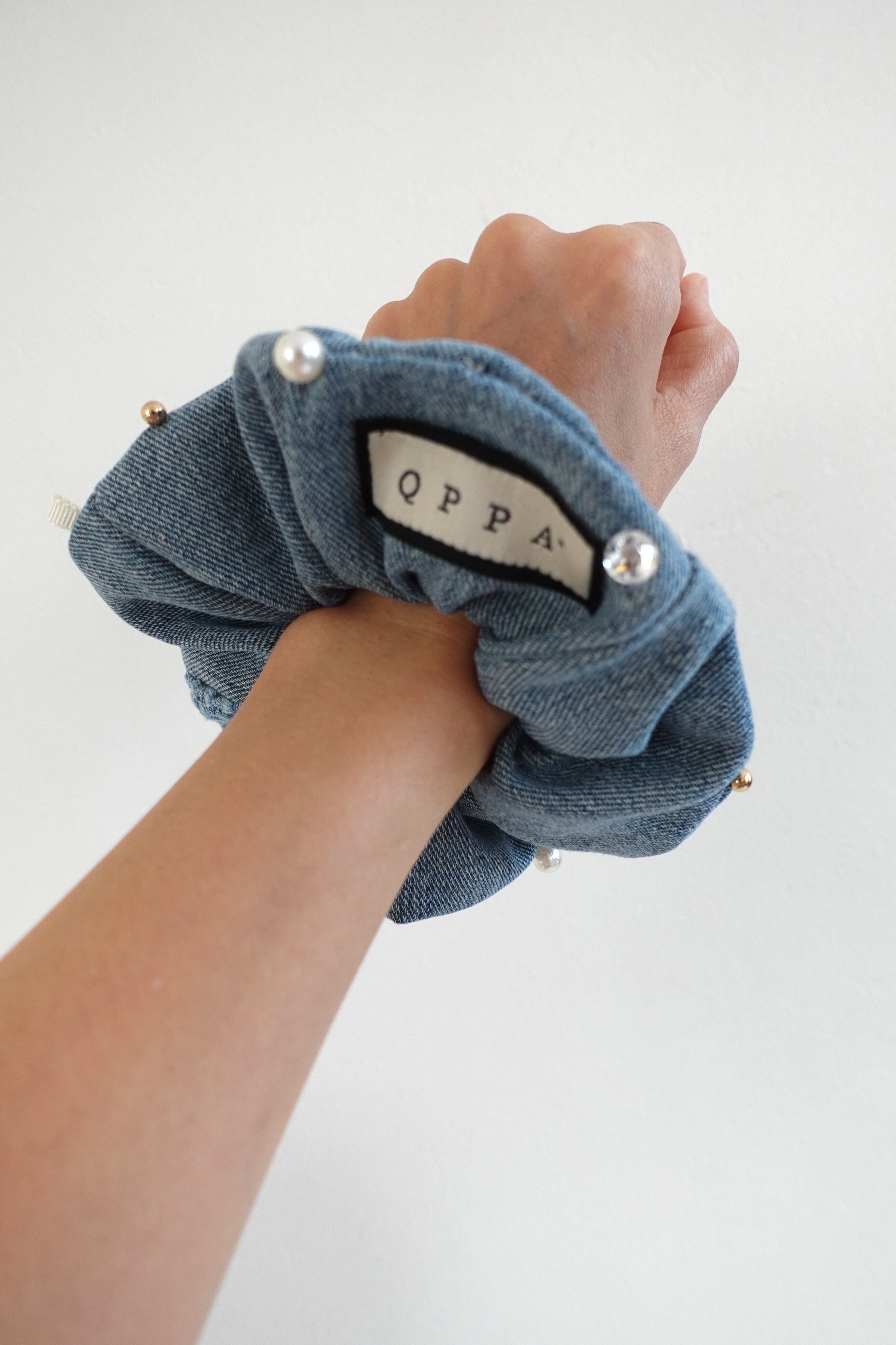 柔らかく色落ちしたアップサイクルデニムに、 パールとビジューをあしらったシュシュ。 カジュアルな素材に繊細な輝きを添え、 日常にもドレスアップにも馴染む上品な仕上がりです。 バッグチャームとしても使える2way仕様で、 リサイクル素材を取り入れたサステナブルなデザイン。 ブランドメッセージ 気持ちごと、包みなおす。 「Hug your hair, hug yourself」 素材に想いを重ねるqppA®︎から、 日常を軽やかに彩るアップサイクルシリーズです。 特徴 アップサイクルデニム使用(サステナブル素材) パール&ビジューアクセント バッグチャーム金具付き qppA®︎ロゴタグ付き 約14cmサイズ(立体ボリュームタイプ)