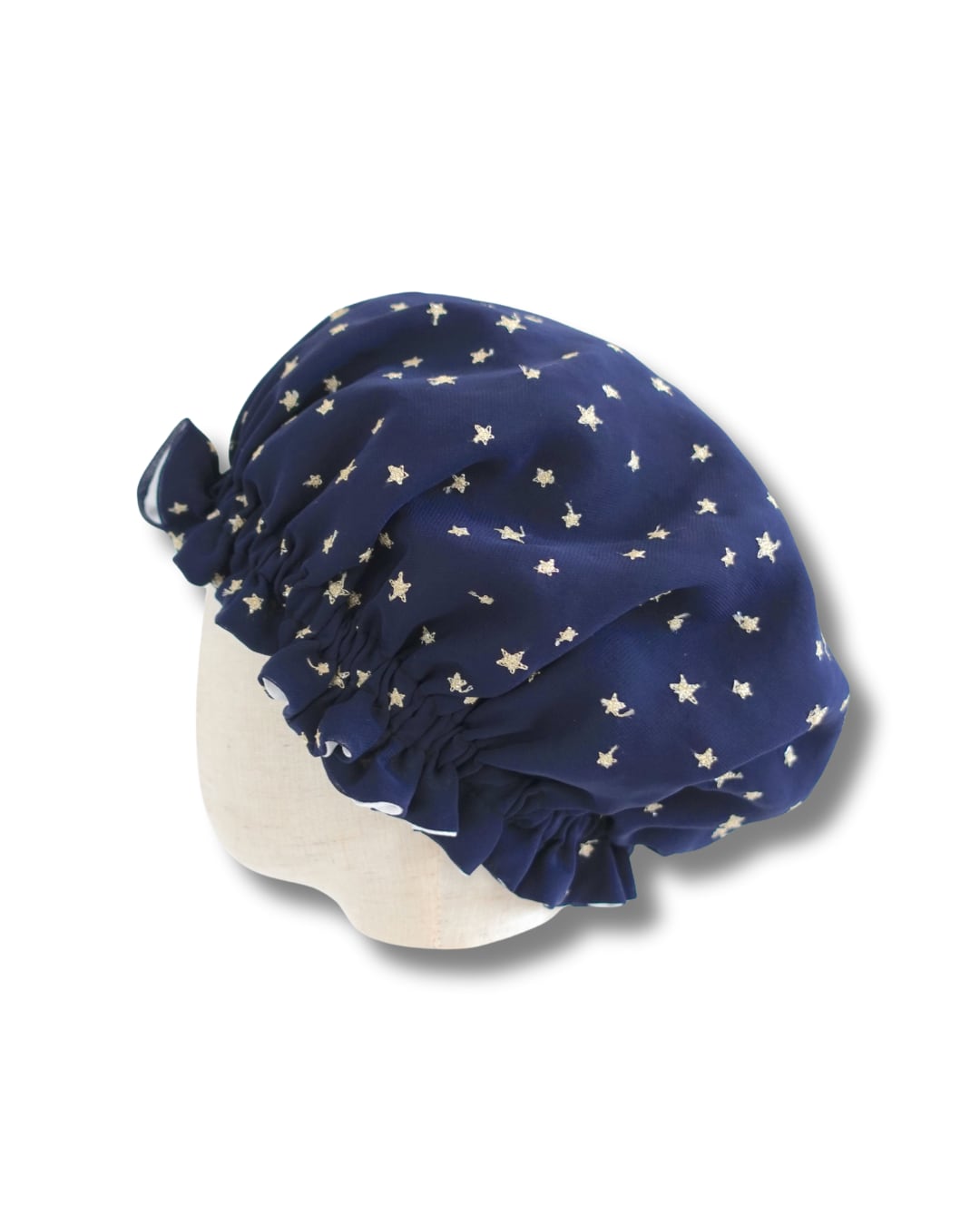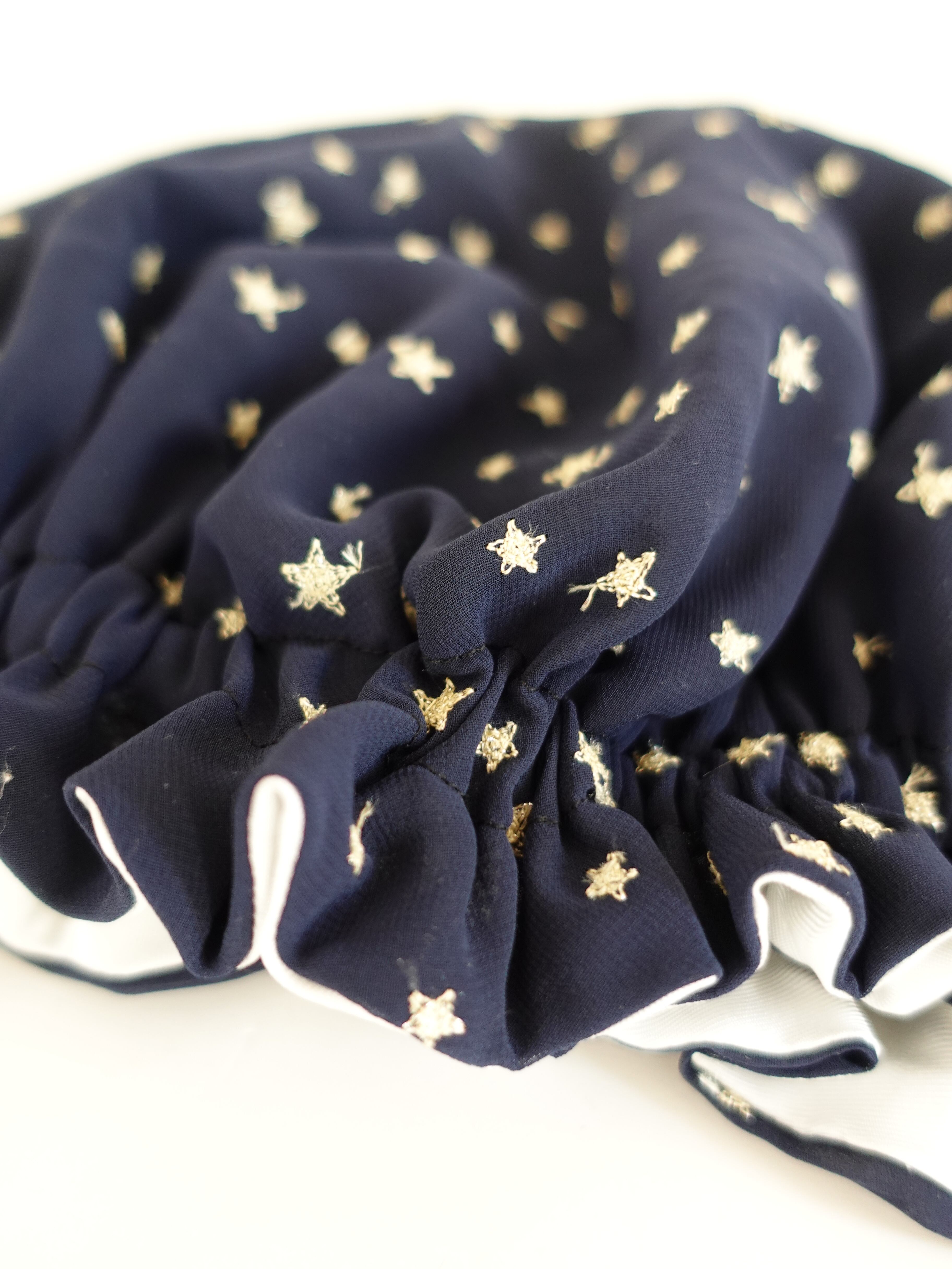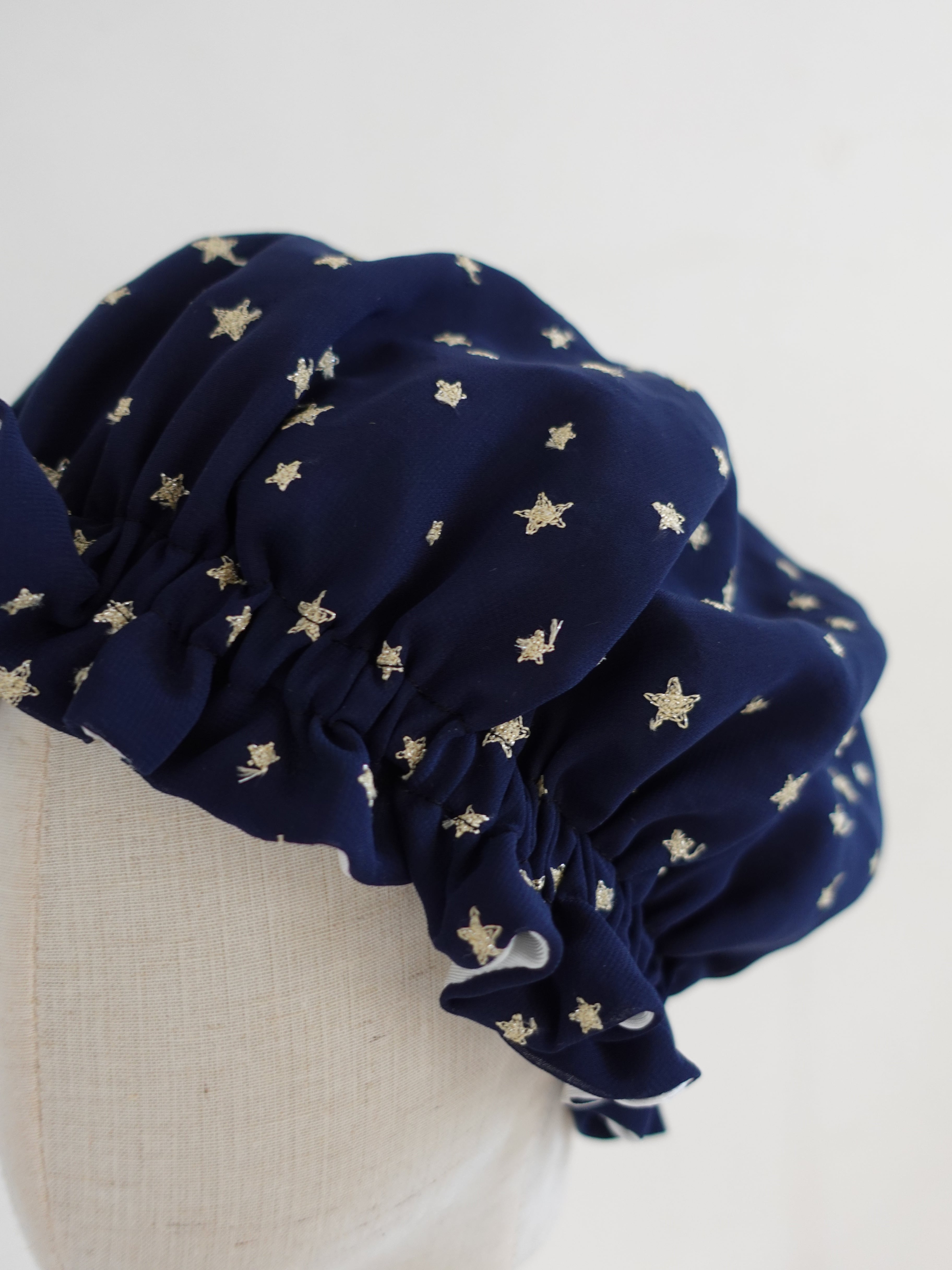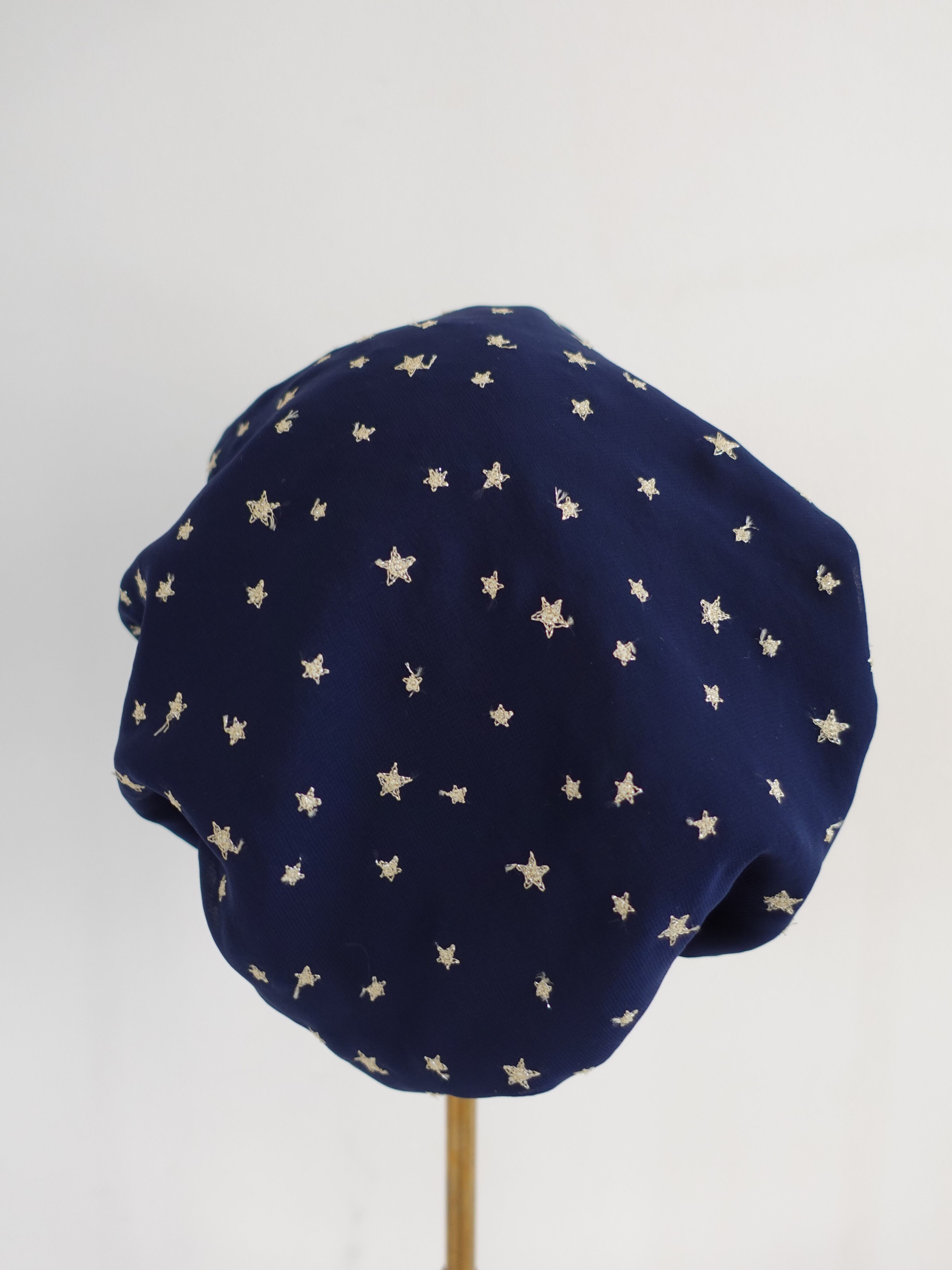 深いネイビーに、ゴールドの小さな星刺繍がそっと瞬く、まるで夜空をかぶっているようなロマンティックなデザイン。