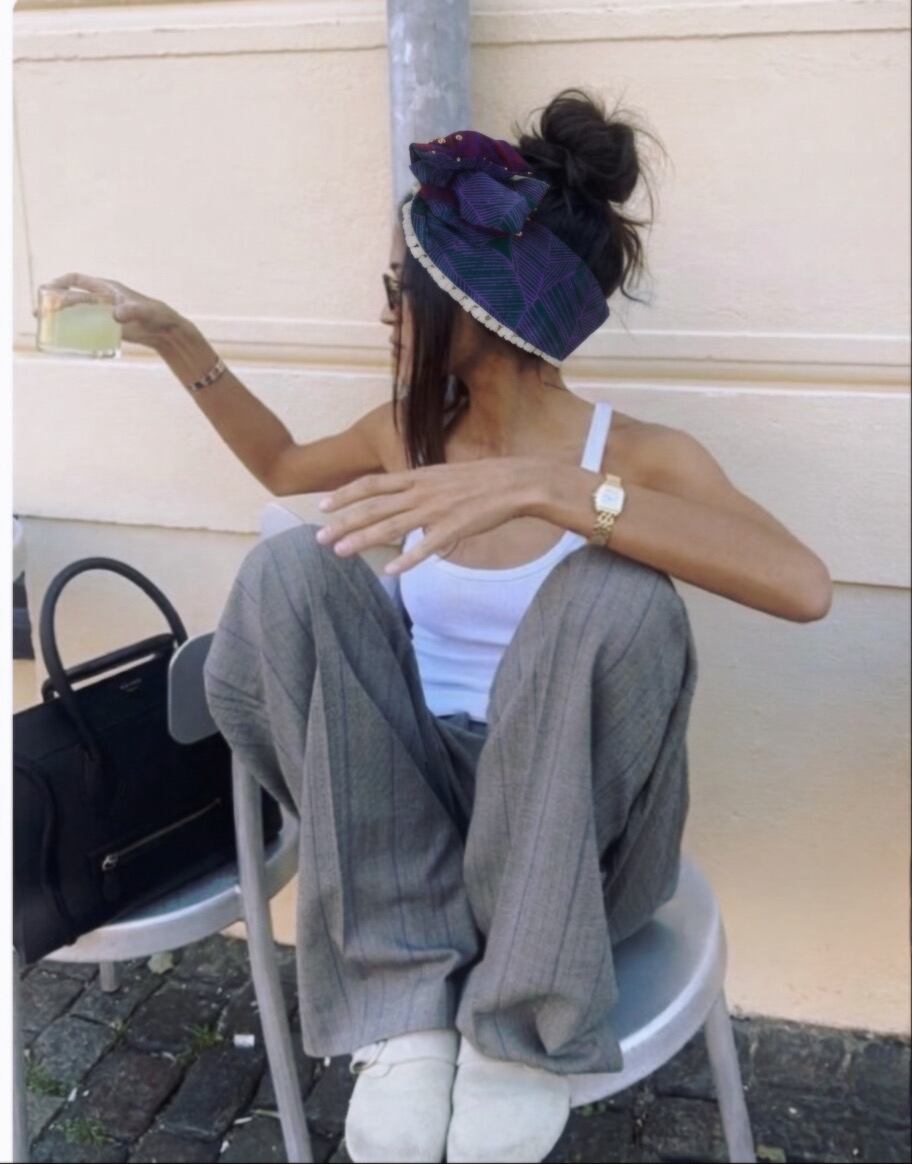 フリンジパイピングがナチュラルな抜け感を添え、ゴールドボールとウッドパーツのビジューが立体的な輝きを散らします。
