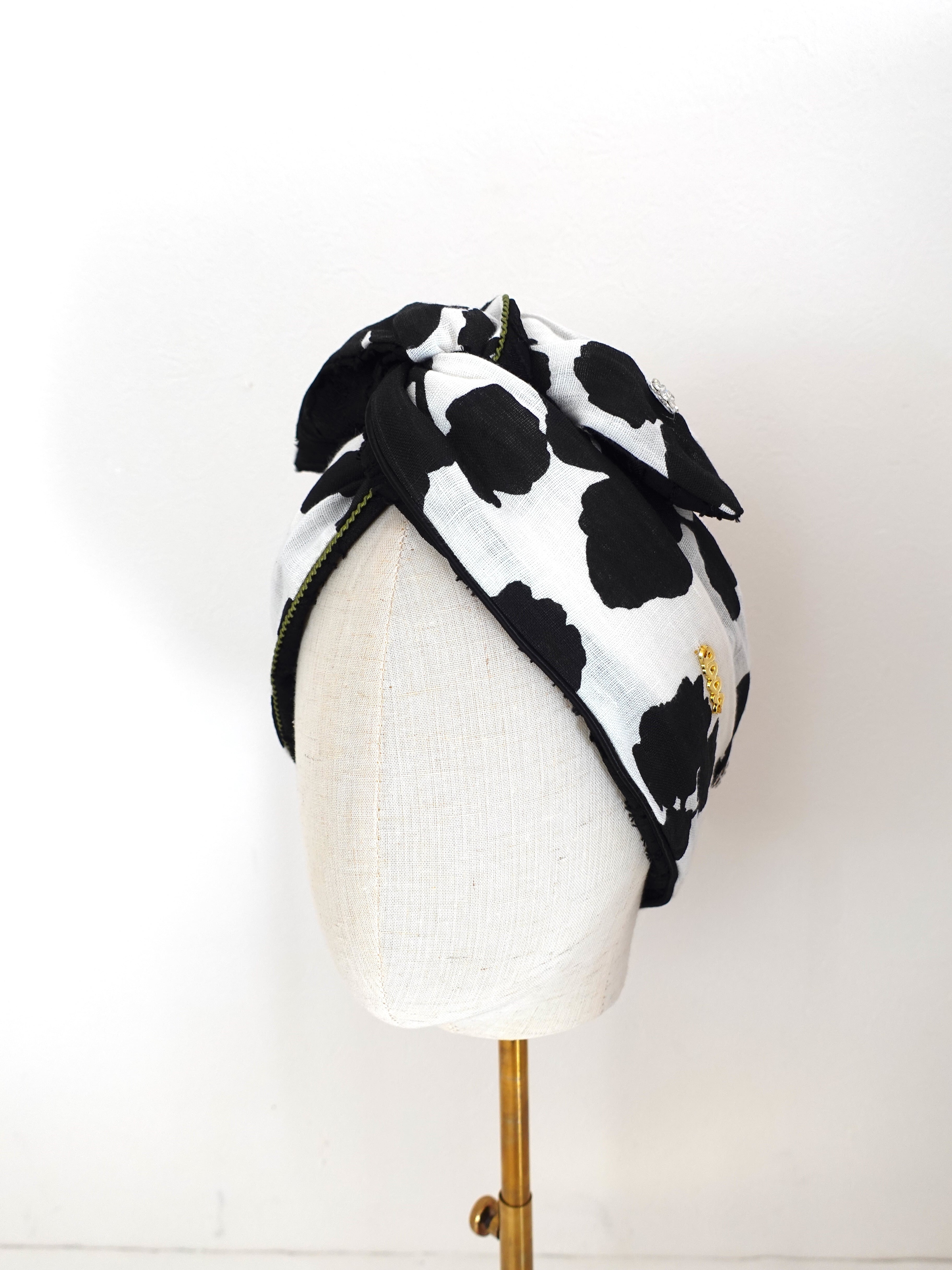 国産リネンに大きな花柄をプリントした白黒の表情は、シンプルな装いの中にひとつだけ主役をつくります。裏面は黒花柄の通気性の良い立体的なお花柄が描かれる、モードな一面へ。