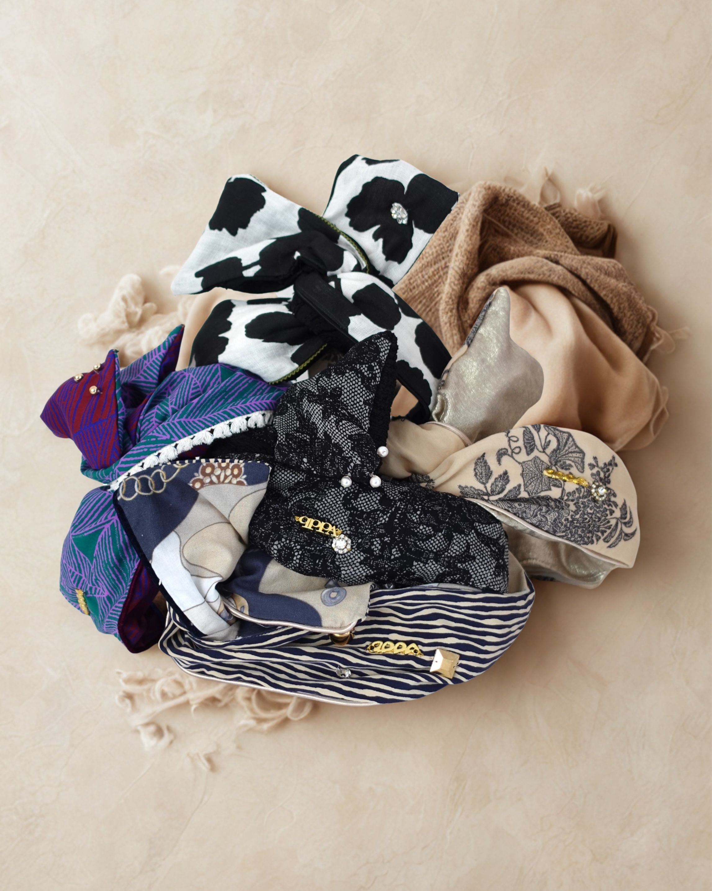 モスグリーンと黒のレーヨン、2種のパイピングが異なる生地の世界をひとつに結び、耳元のパールとインドビジューがさりげない輝きを添えます。