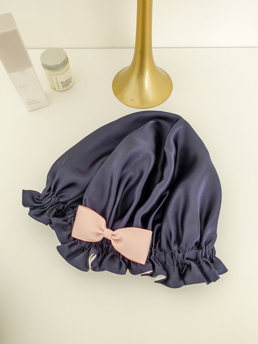 選べるリボンsilk nightcap navy 国産洗えるシルク