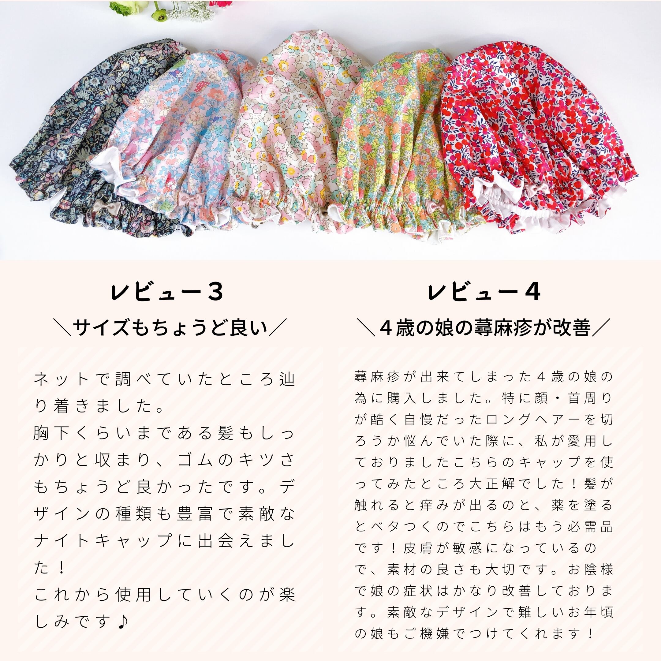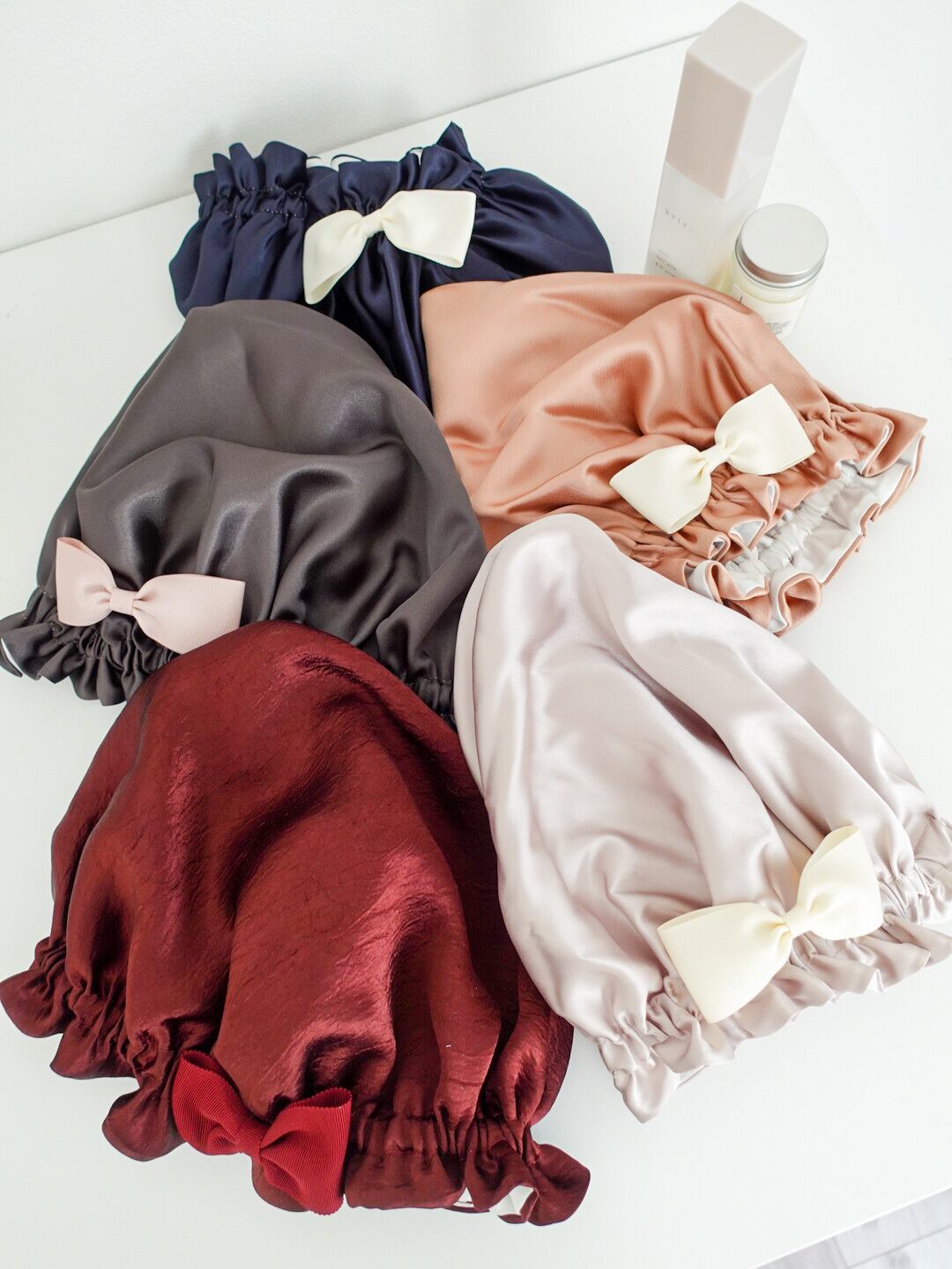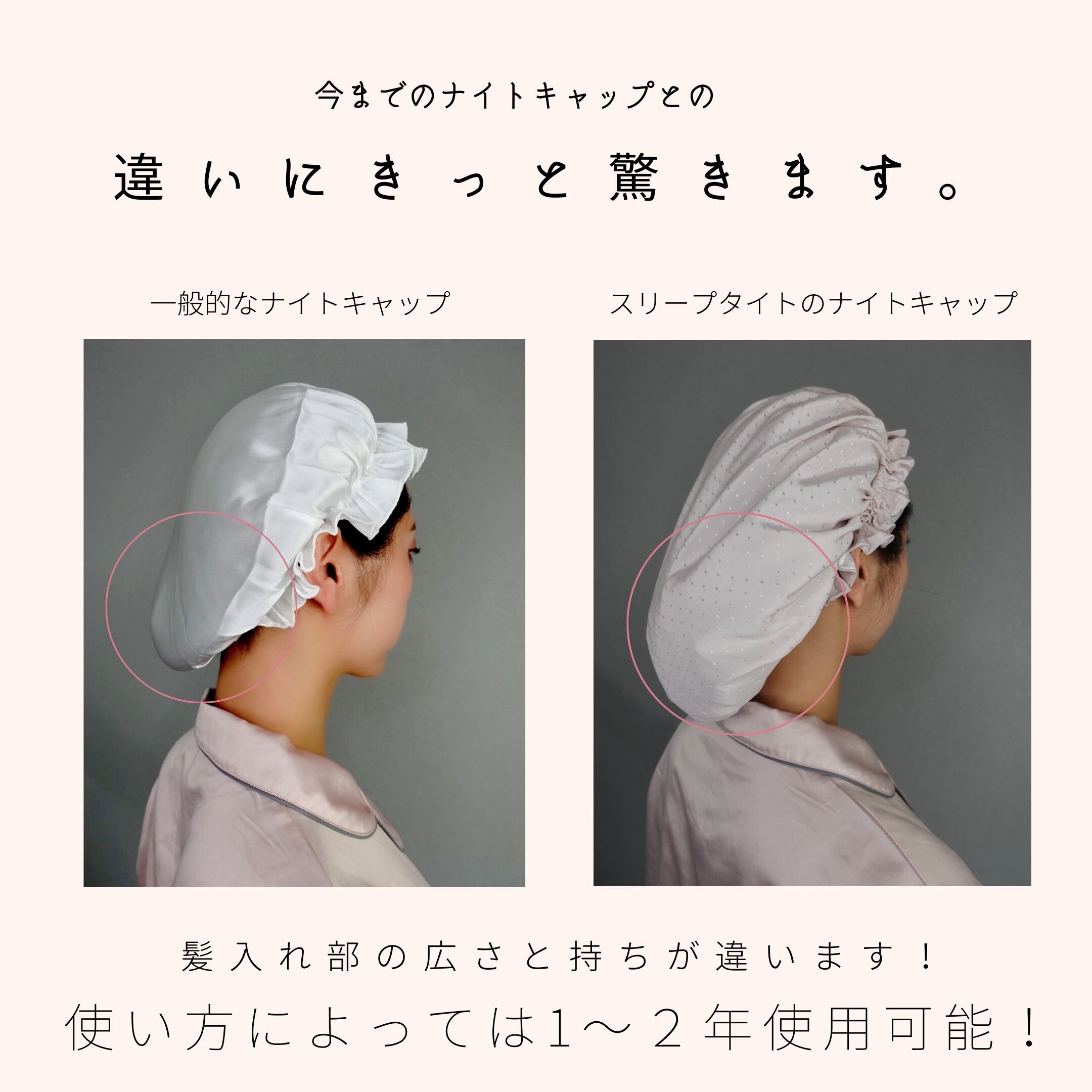 ●洗髪・ドライ後ナイトキャップの中に髪の毛を全てすっぽりとしまいゴム部分を耳上に持ってきてかぶります。※半乾きでのご使用は避けて下さい。
