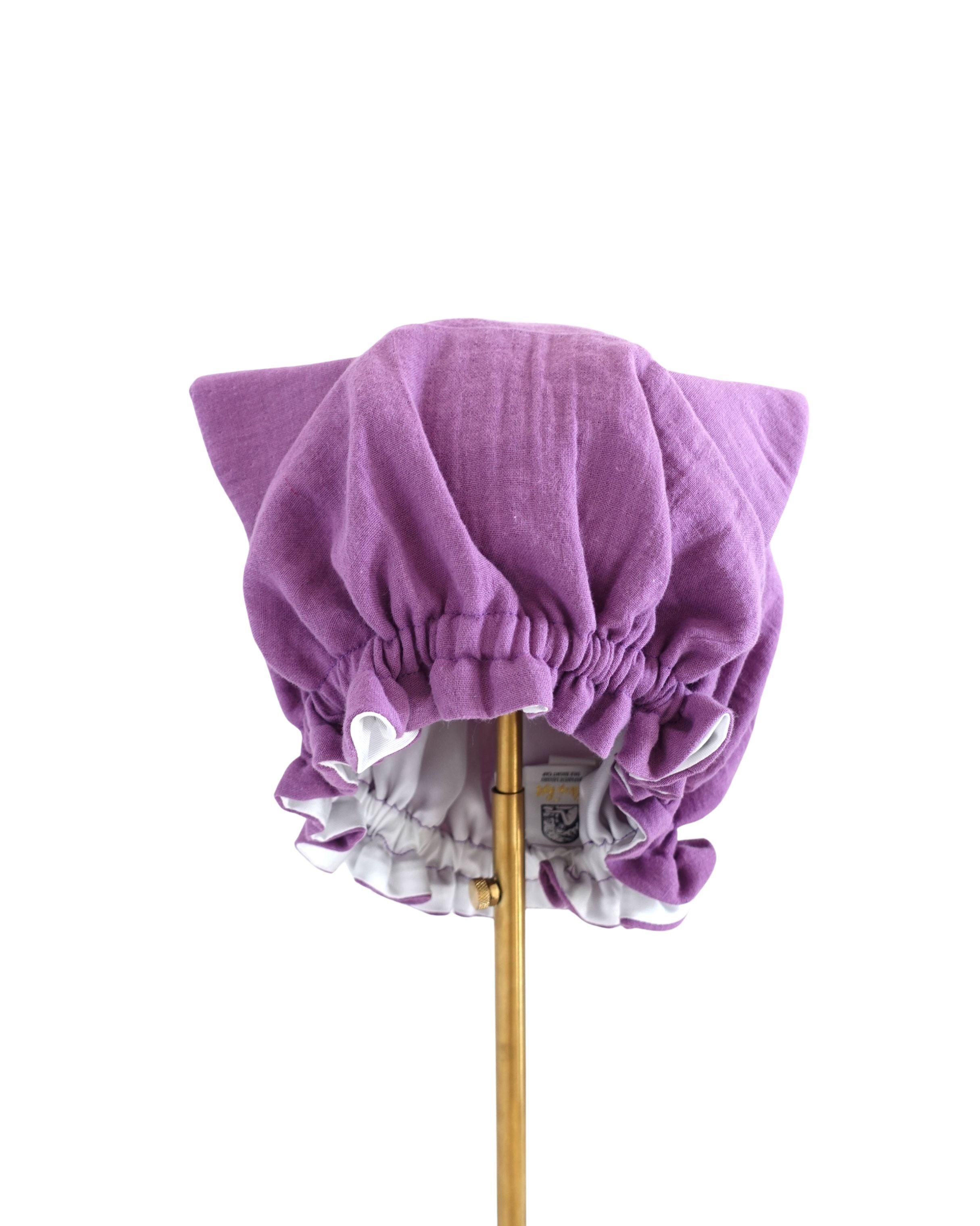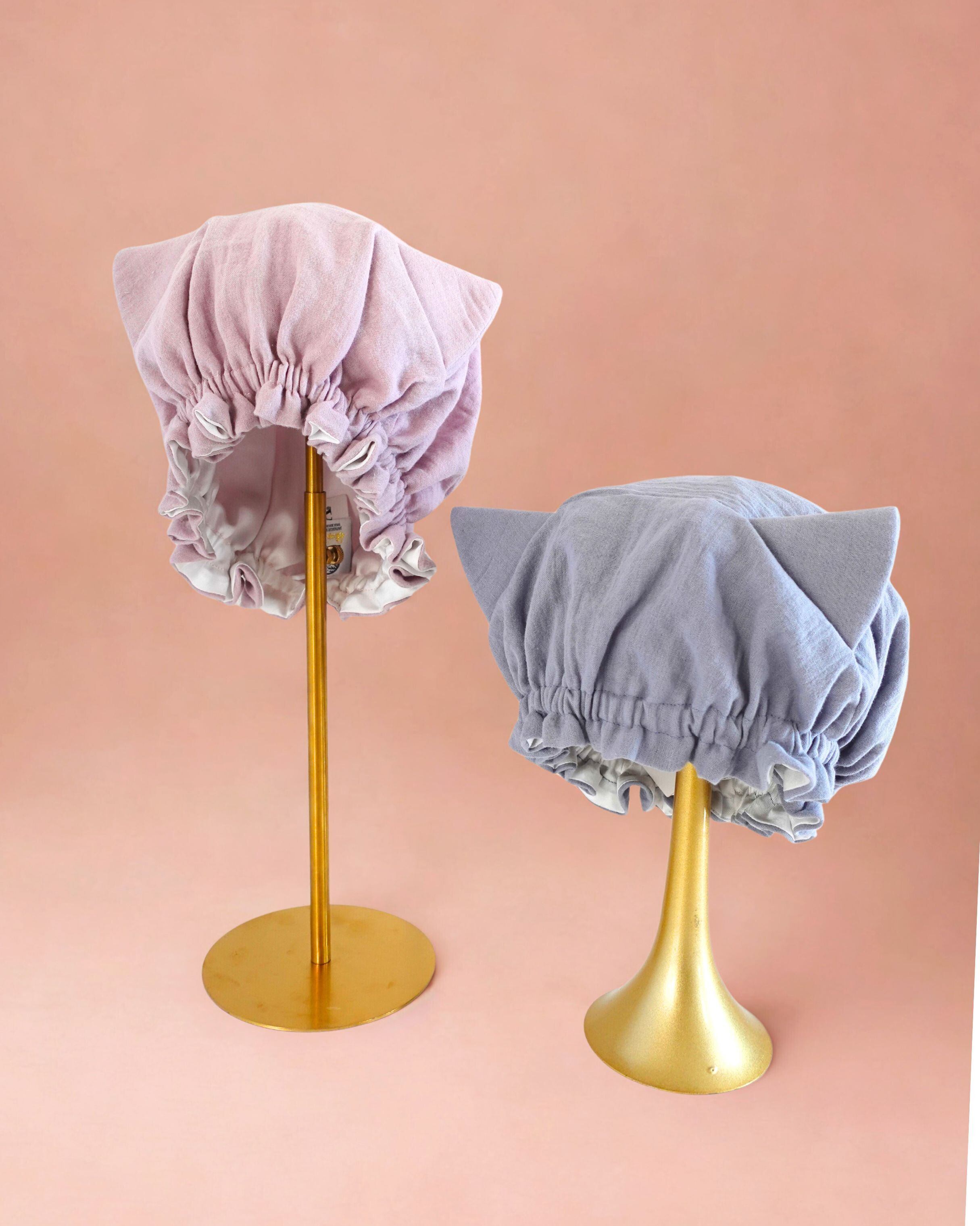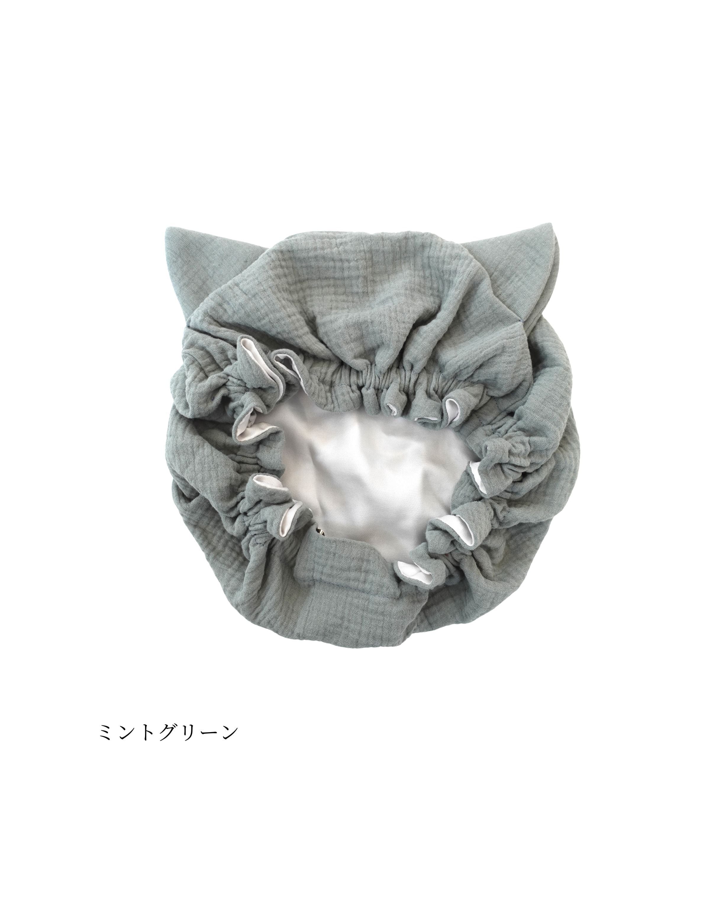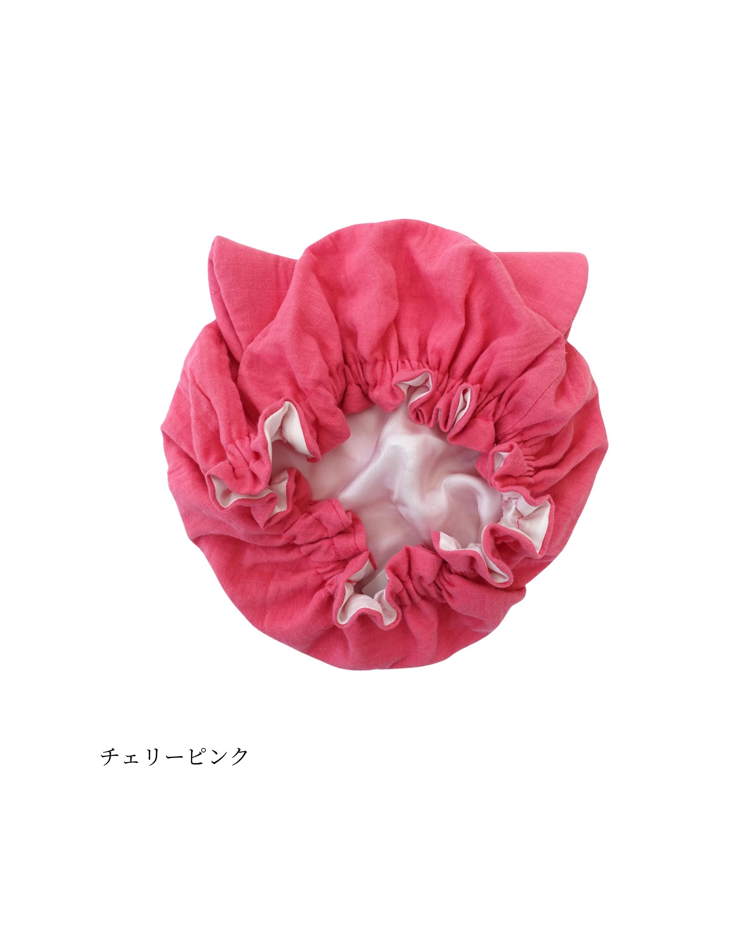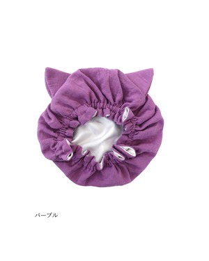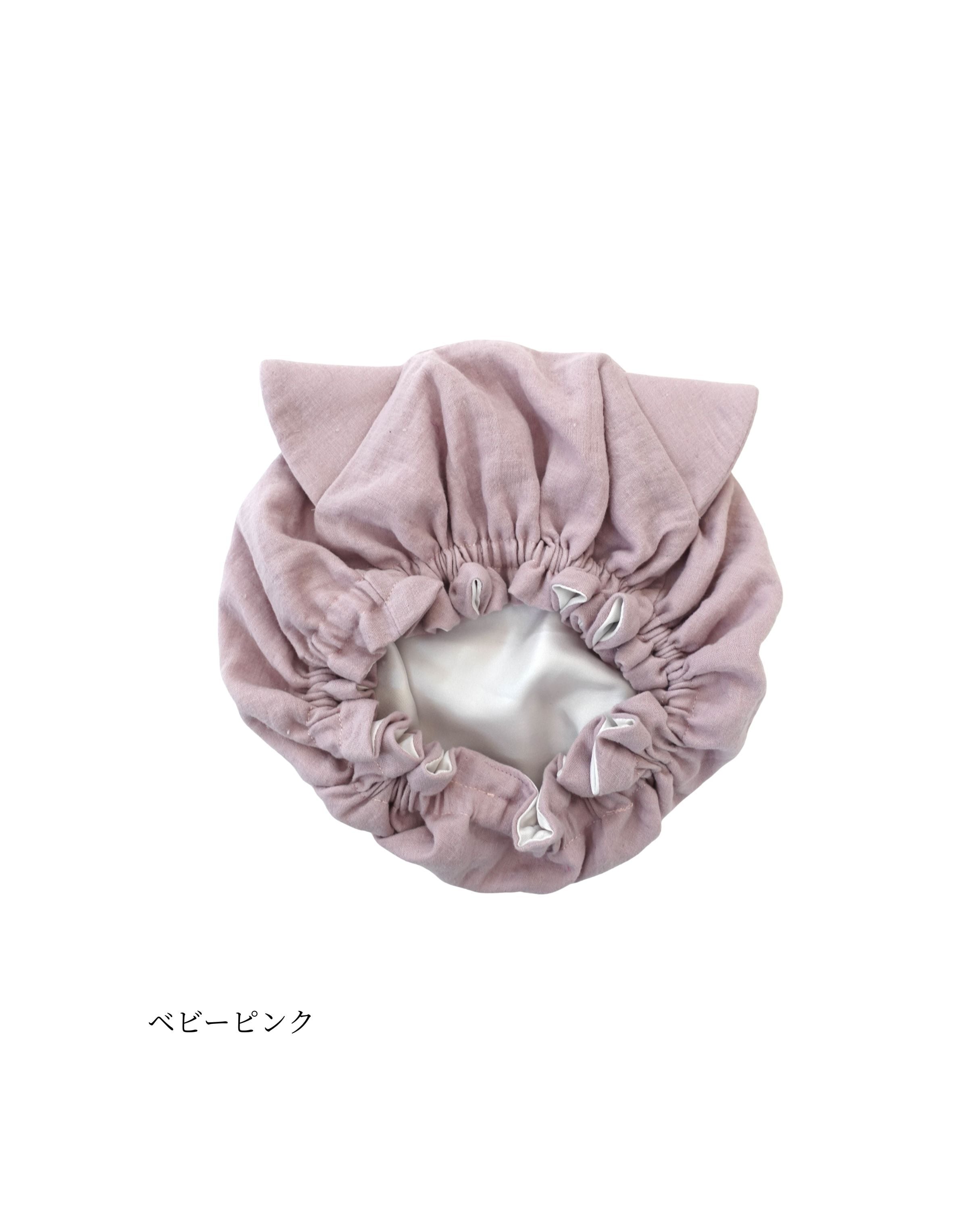 ●洗髪・ドライ後ナイトキャップの中に髪の毛を全てすっぽりとしまいゴム部分を耳上に持ってきてかぶります。※半乾きでのご使用は避けて下さい。