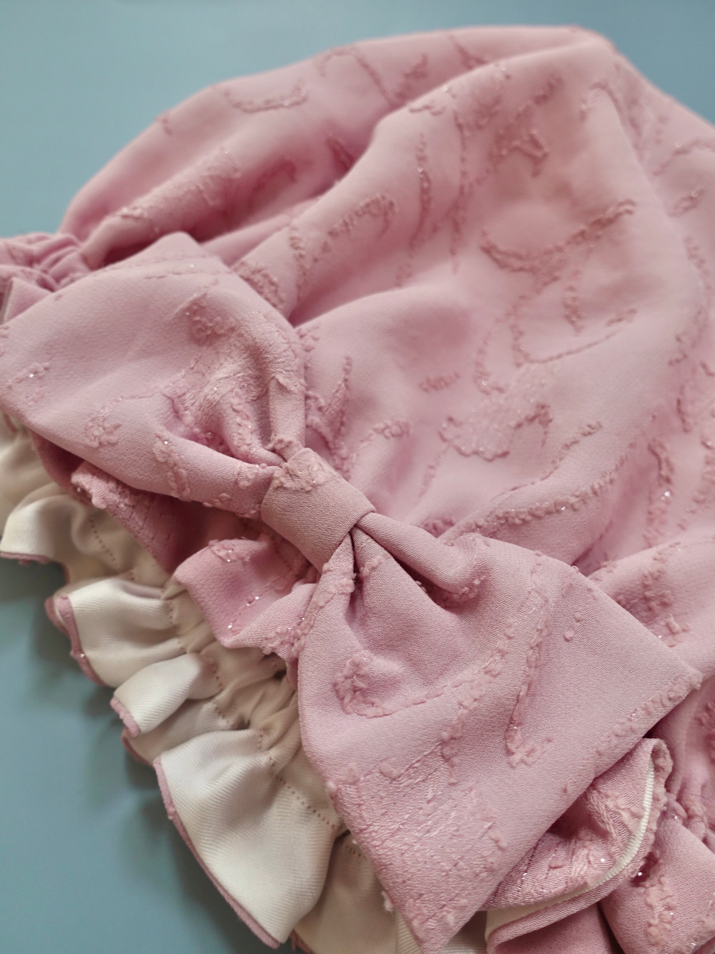 ラベンダーピンクフラワーラメのエンボスパターンナイトキャップラベンダーピンク色のベースに繊細なエンボスパターンが施され、エレガントな大きなリボンが特徴です。リラックスした夜を過ごすためのパジャマやローブと合わせやすいです。