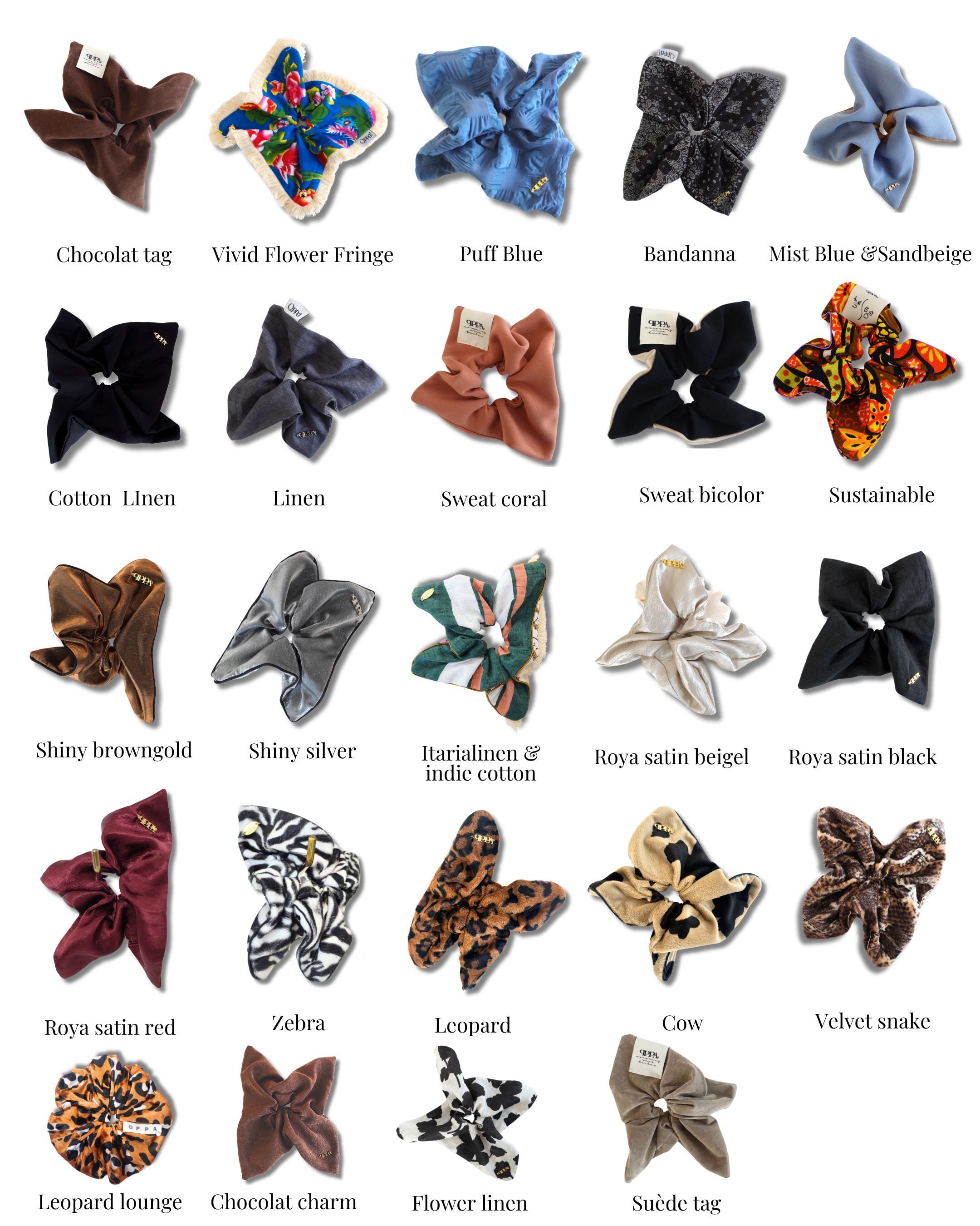 アクセサリー: スクエアシュシュを髪に結んで、上品な仕上げ