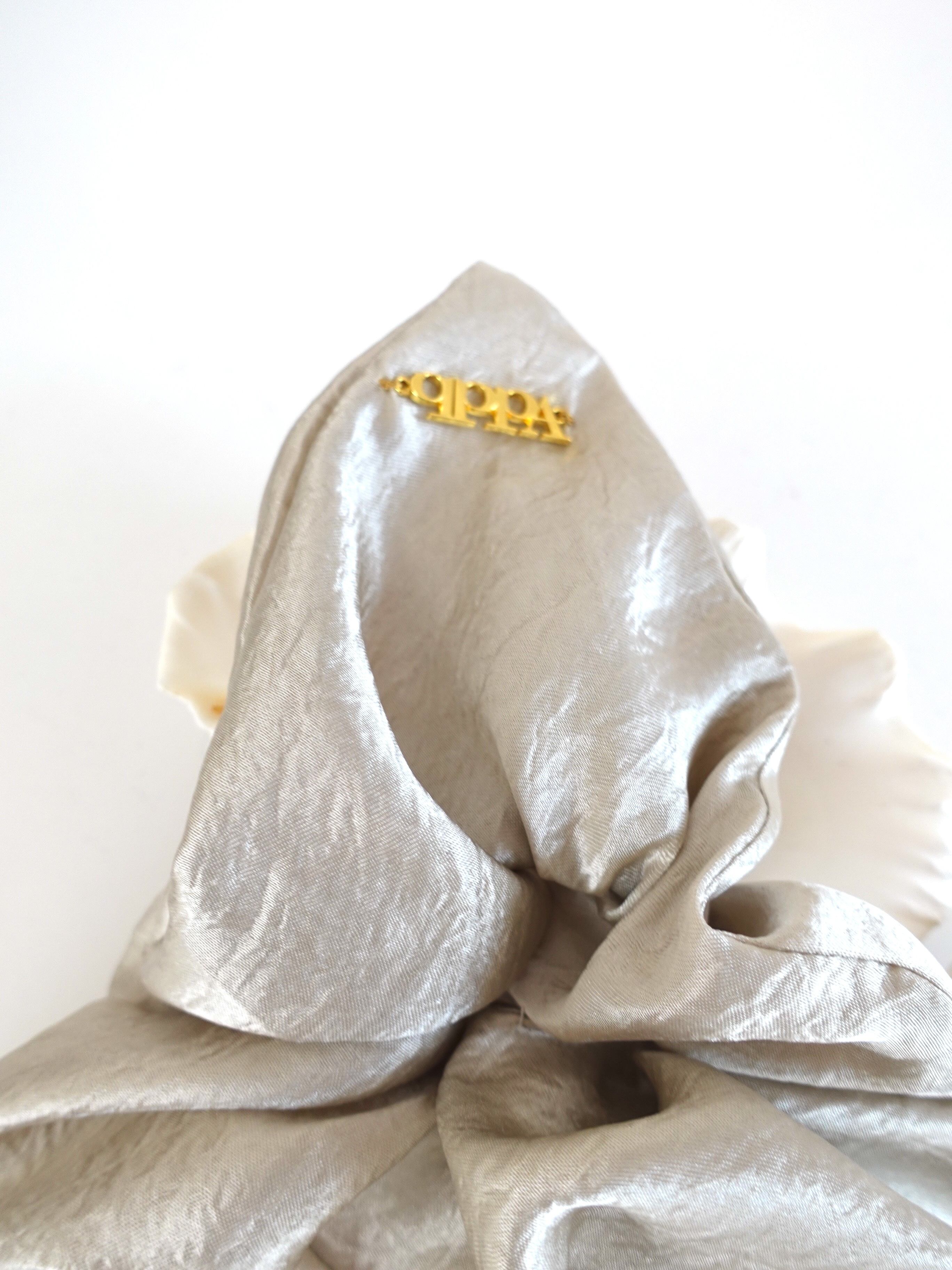 ネイビーのブラウスとベージュのスラックスに合わせて、スクエアシュシュをひとつ結びに。控えめな光沢が上品さを引き立てます。